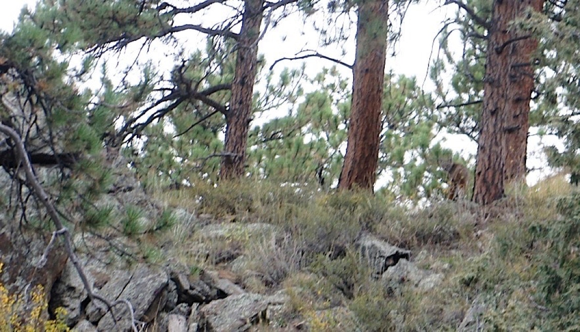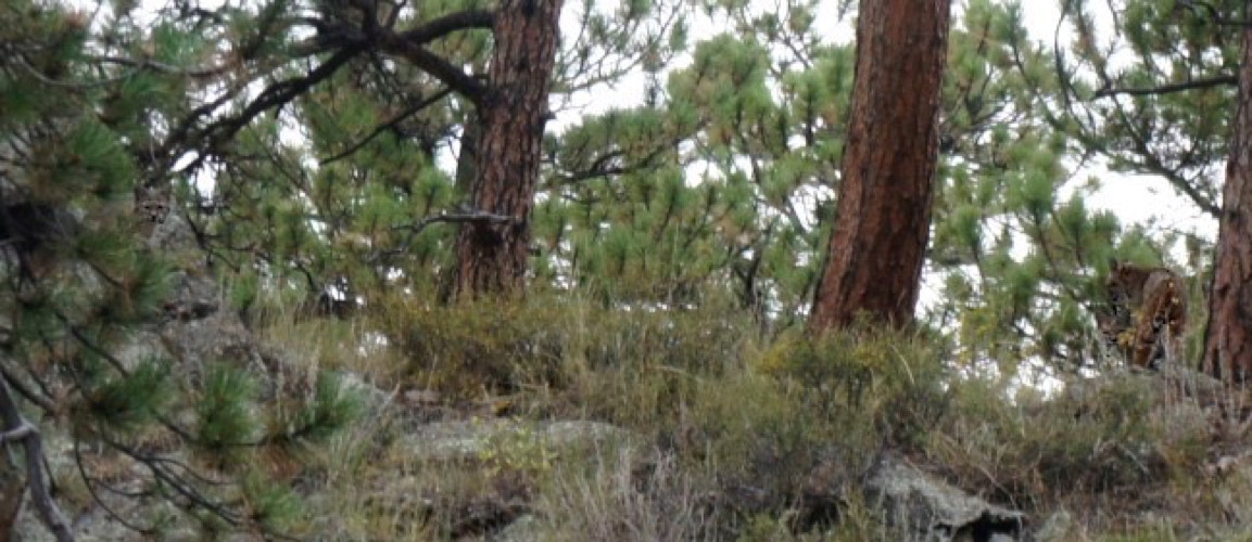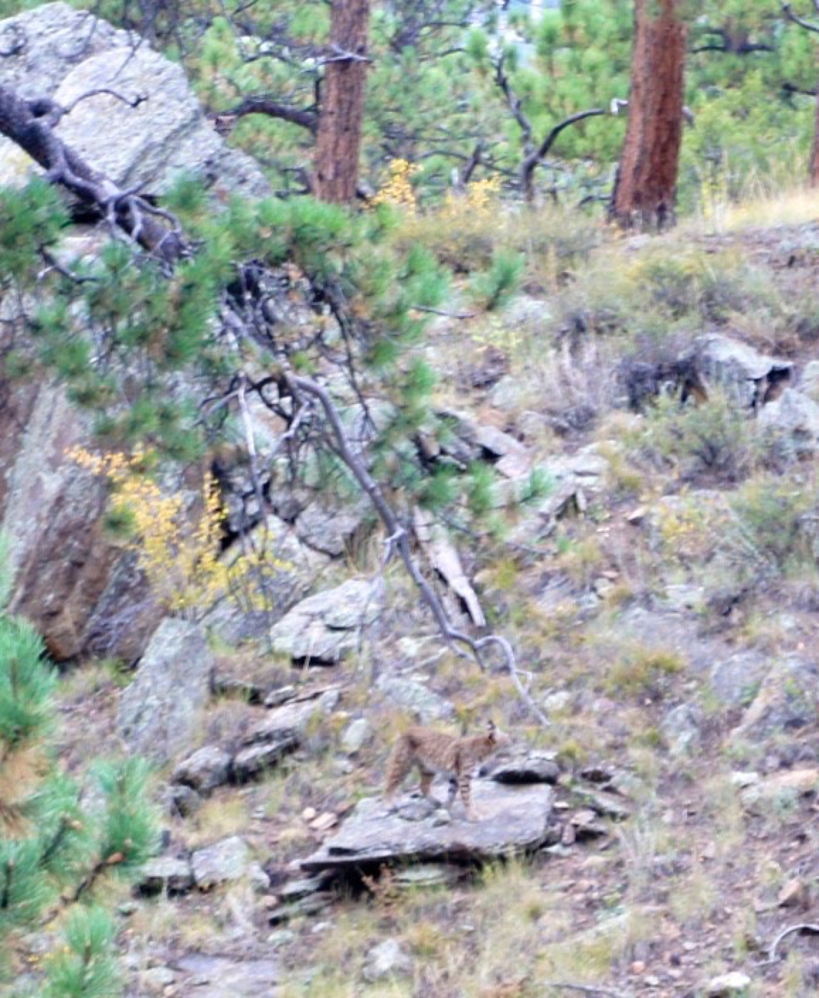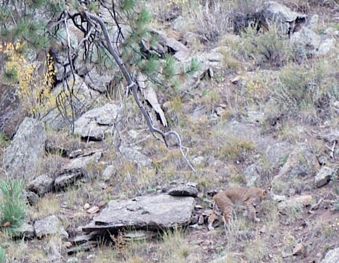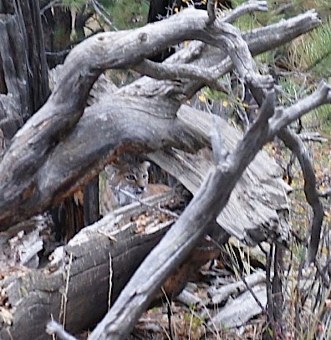 Het is even wennen hoe je moet zitten, maar het went eigenlijk al snel. Het pad dat we volgen is aardig steil, rotsig en bochtig. Maar de paarden weten hun weg te vinden, dus we hoeven ze niet veel te sturen. Af en toe, als ze een beetje wegglijden over de rotsen, of een diepere stap moeten doen is het wel even oppassen. Maar op een gegeven moment begin ik me al een aardige cowboy te voelen. Teugel in een hand, andere hand op de dij en rijden maar. Ik realiseer me natuurlijk dat wat we doen nog niks met paardrijden te maken heeft. Alhoewel een eindje verderop wordt het interessant. We zijn al aan de terugweg bezig naar beneden als Marja ineens- denkt ze – een rode kat ziet. Maar bij de receptie van de campground lag een foto van een bobcat die een keer op de campground was gesignaleerd. Is het dat dan misschien. Maar dan ziet ze ineens de kwastjes op zijn (wat even later een haar blijkt te zijn) oren. Dus is het een lynx. Marja stopt haar paard. Ze weet hoe dat moet, wurmt haar camera uit haar tas en probeert een paar foto;s te maken. Dan ineens zien we drie koppies van jonge lynxjes boven een rots uitsteken. Geweldig gewoon. Marja heeft er een paar leuke foto’s van kunnen maken.