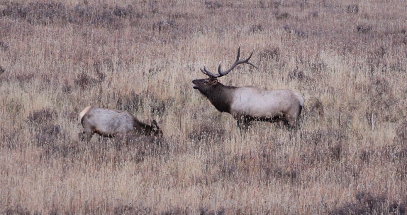 Om half zeven lopen we, gewapend met de cam-corder op statief en de fotocamera het stukje naar de plek waar gister dat gevecht plaatsvond. Nog geen leven. Een eindje verder zien we een bull met een stuk of acht vrouwtjes aan de kant van de weg staan. In eerste instantie durven we niet goed door te lopen. Hij doet nl/ erg zijn best om zijn harem bij elkaar te houden. Maar als hij wil oversteken blijven een paar van de vrouwtjes achter. Dus weer terug naar die kant en dan blijven er aan de andere kant weer een paar staan. Het stel loopt vervolgens een heuveltje op en wij kunnen weer verder. Al snel begint het weer aardig druk te worden. Dan hebben we het over even na zevenen volgens mij. En er lopen jongens tussen met kanonnen van lenzen, gecamoufleerd en al, dat wil je niet weten. Er komen ook steeds auto’s bij. En als we een beetje dat heuveltje gerond hebben zien we dat de Elk en zijn harem waarschijnlijk daar de weg wil oversteken naar de grote weide daarachter. Maar al die mensen met hun camera’s en al die auto’s blokkeren eigenlijk zijn pad. Dan lopen er twee vrouwtjes toch naar de andere kant van de weg en hij er achteraan. Maar dan blijven er weer een paar dames achter. En de terugweg is zo langzamerhand helemaal afgesneden voor hem. Uiteindelijk heeft ie dan nog twee van de vrouwtjes bij zich in de buurt. Of hij zijn harem later weer compleet kan maken weten we niet. Maar ik heb bijna een beetje medelijden met hem, dat al die mensen hem in de weg staan om een goeie bull te zijn. Ze zouden wijzer moeten zijn.