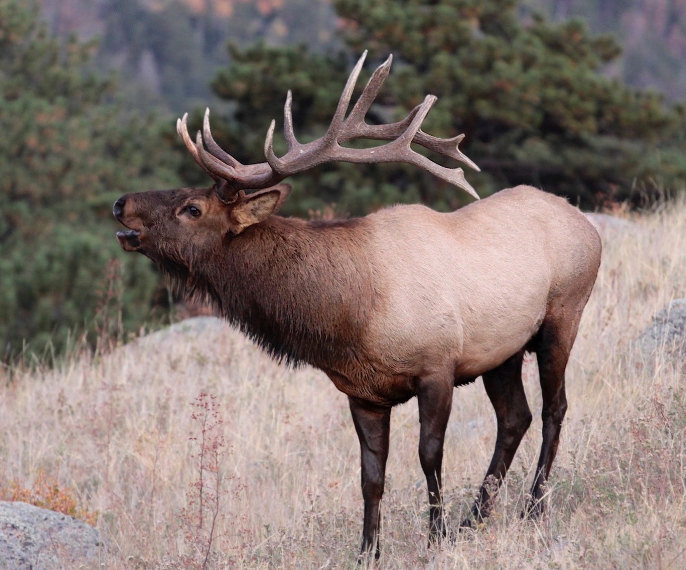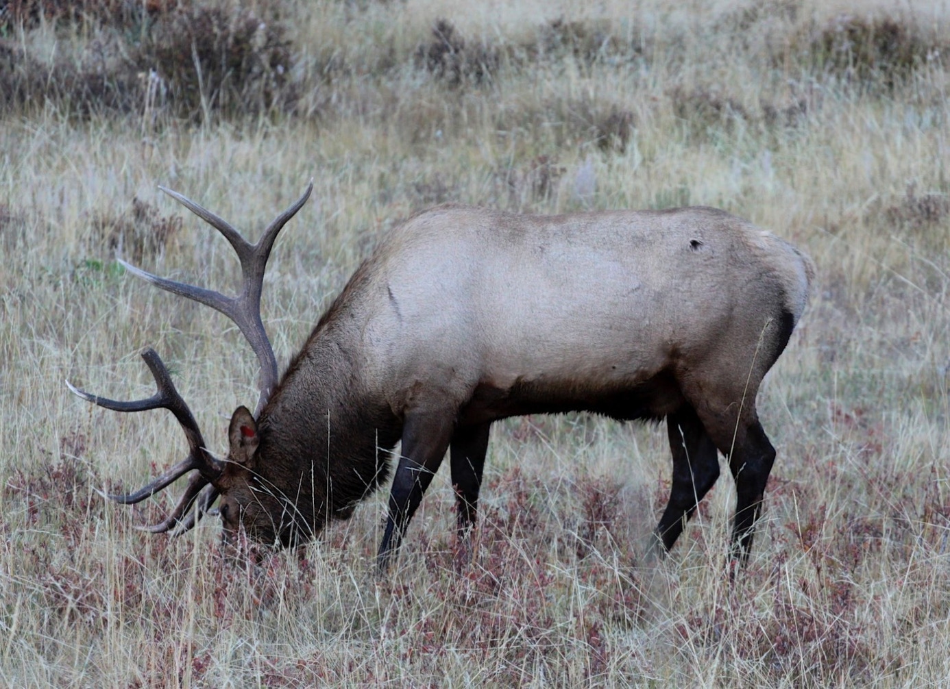 Net weer ff te laat op (half zeven of zo, jaah das te laat) en ook geen Elks of Muledeer in onze achtertuin bij de campground. En daar hadden we deze plek nu juist voor uitgekozen omdat ie zo geschikt leek om wildlife te zien. Maar we besluiten toch met de camper naar een paar plekken te rijden waar we ze nog wel kunnen zien. Als we dan de campground afrijden, zien we ineens een heleboel mensen rondom hun tenten staan. En verdomd, daar staan gewoon Elks midden tussen de tenten. In de B-loop. Dus als we hier nog een keer terugkomen dan gaan we in die loop staan. Zul je zien dat ze dan wel op de weide komen waar we nu bij staan.