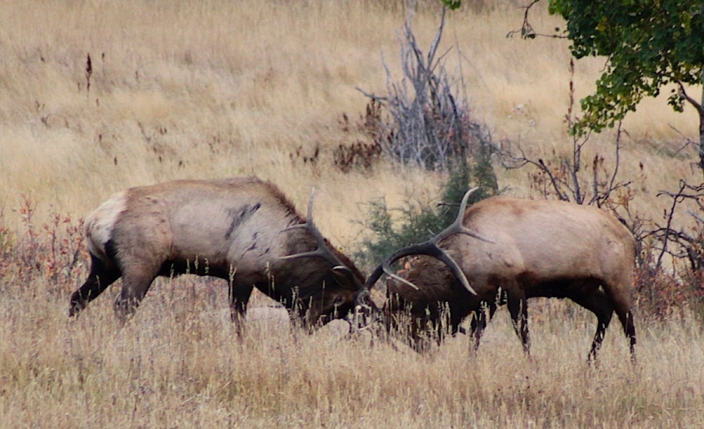 De middag doen we ff niets behalve kijken of het scherm nog verdere schade heeft opgelopen. Dat valt gelukkig mee. Tegen de avond willen we toch nog even kijken of er beneden in de Valley misschien nog wat te beleven valt. Net buiten de campground is het al weer een drukte van jewelste. Dus de camper ook maar weer aan de kant gezet (dan hebben we nog geen kilometer gereden). En daar blijkt een bull-fight aan de gang te zijn. Een goeie plek zoeken om te filmen en een paar actiefoto’s te maken. In de hectiek draait Marja het indrukken van de knop op haar cam-corder om. Dus als ze denkt dat ze staat te filmen staat ie uit en andersom. Gevolg dat de mooie beelden die ze zag op het schermpje helaas niet worden opgeslagen. En uiteindelijk heeft ze een twee seconden beeld van dit gevecht. Jammer maar niks aan te doen. Ik zie ondanks de drukte nog kans op een paar mooie plaatjes te maken. Marja heeft aardig de ziekte in. Het zou ook wel een erg mooi filmpje geweest zijn.