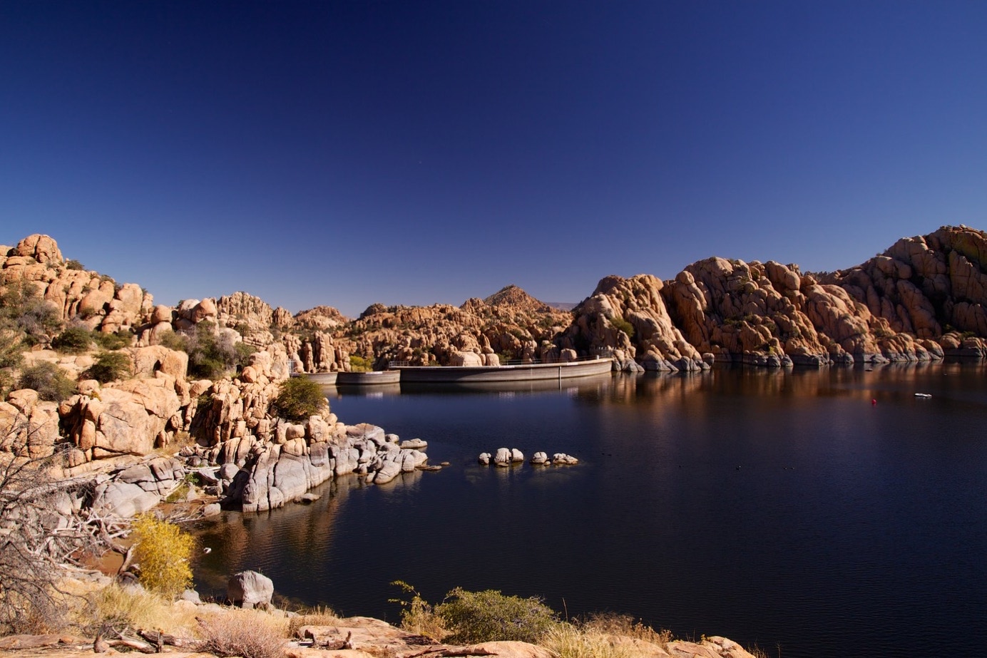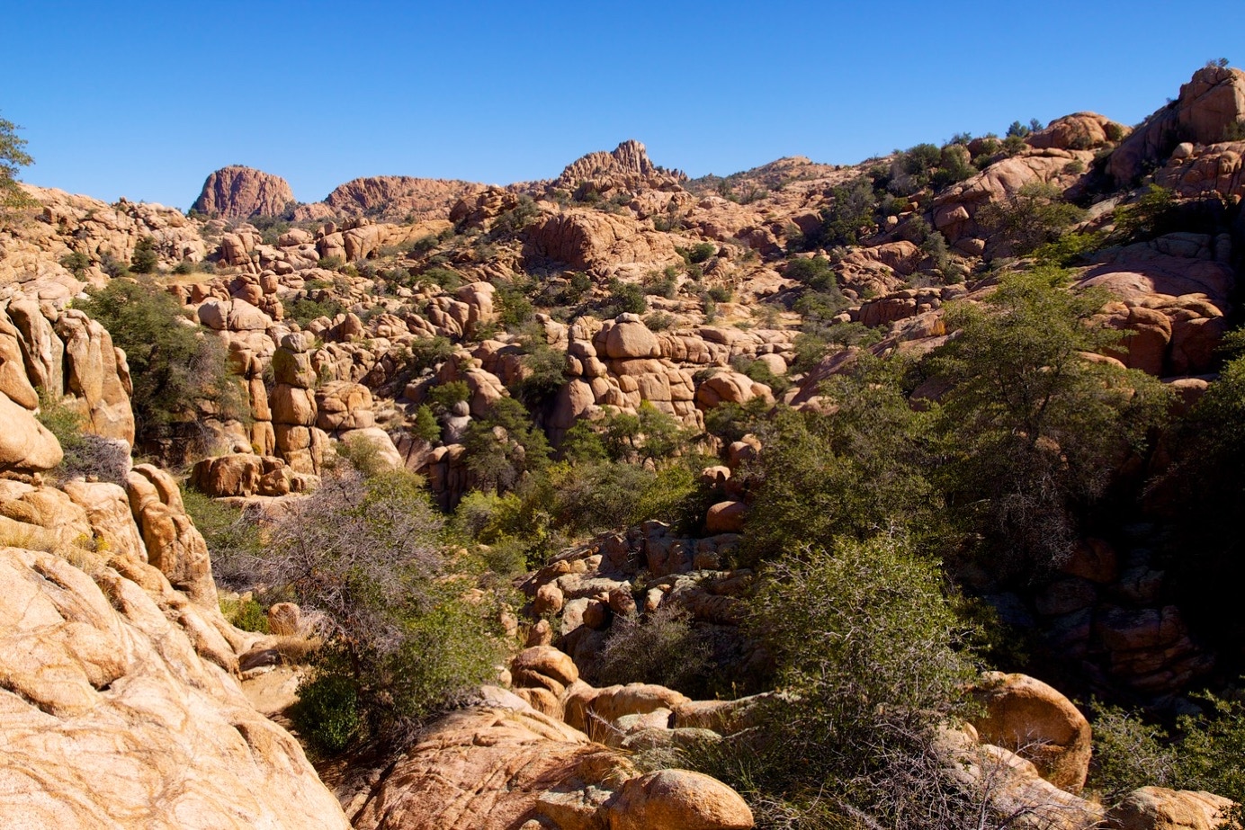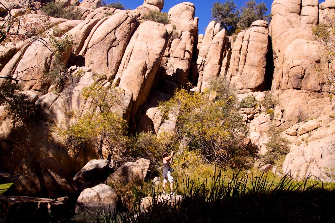 Als we een eindje op weg zijn realiseren we ons dat dit toch wel een bijzondere plek is. Een plek waarvan we ons afvragen waarom dit in hemelsnaam niet ook op zijn minst een state-park status waard is. Het is nl. zo bijzonder qua omgeving, maar ook hoe de paden zijn aangelegd, of liever in het veld zelf zijn aangegeven. Dat laatste betekent, dat ze af en toe gewoon de beste weg naar boven of beneden hebben aangegeven met witte stippen. Dus daar moet je goed op letten. Als je er daar eentje van mist kan het zo maar gebeuren dat je een verkeerd pad neemt. Dus dat gebeurt ons dus ook. Met als gevolg dat we minstens een halve mijl, zo niet een mijl om moeten lopen. Als we dan op de weg terug zijn naar het goede pad (gelukkig staan er overal langs de trail bordjes waarop is aangegeven waar je je bevindt) komen we een oud stel tegen met een Australische cattledog, die we eerder achter ons hadden. Dus die zijn kennelijk in eerste instantie wel de goede weg gegaan, maar hebben verderop een verkeerde afslag genomen, zodat we elkaar nu tegenkomen in tegengestelde richtingen. We lopen uiteindelijk een eindje dezelfde richting uit tot we bij een bruggetje komen. Wij besluiten door te gaan, maar het oude stel twijfelt nog steeds (vooral de vrouw) of ze wel de goede kant uitgaan. Verderop blijkt dat wij de juiste beslissing hebben genomen. Het oude stel hebben we niet meer terug gezien.