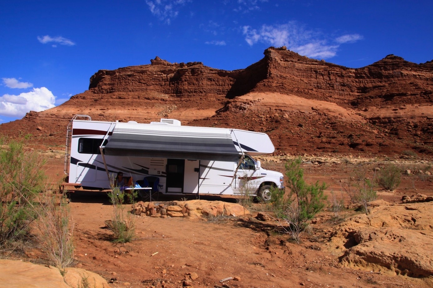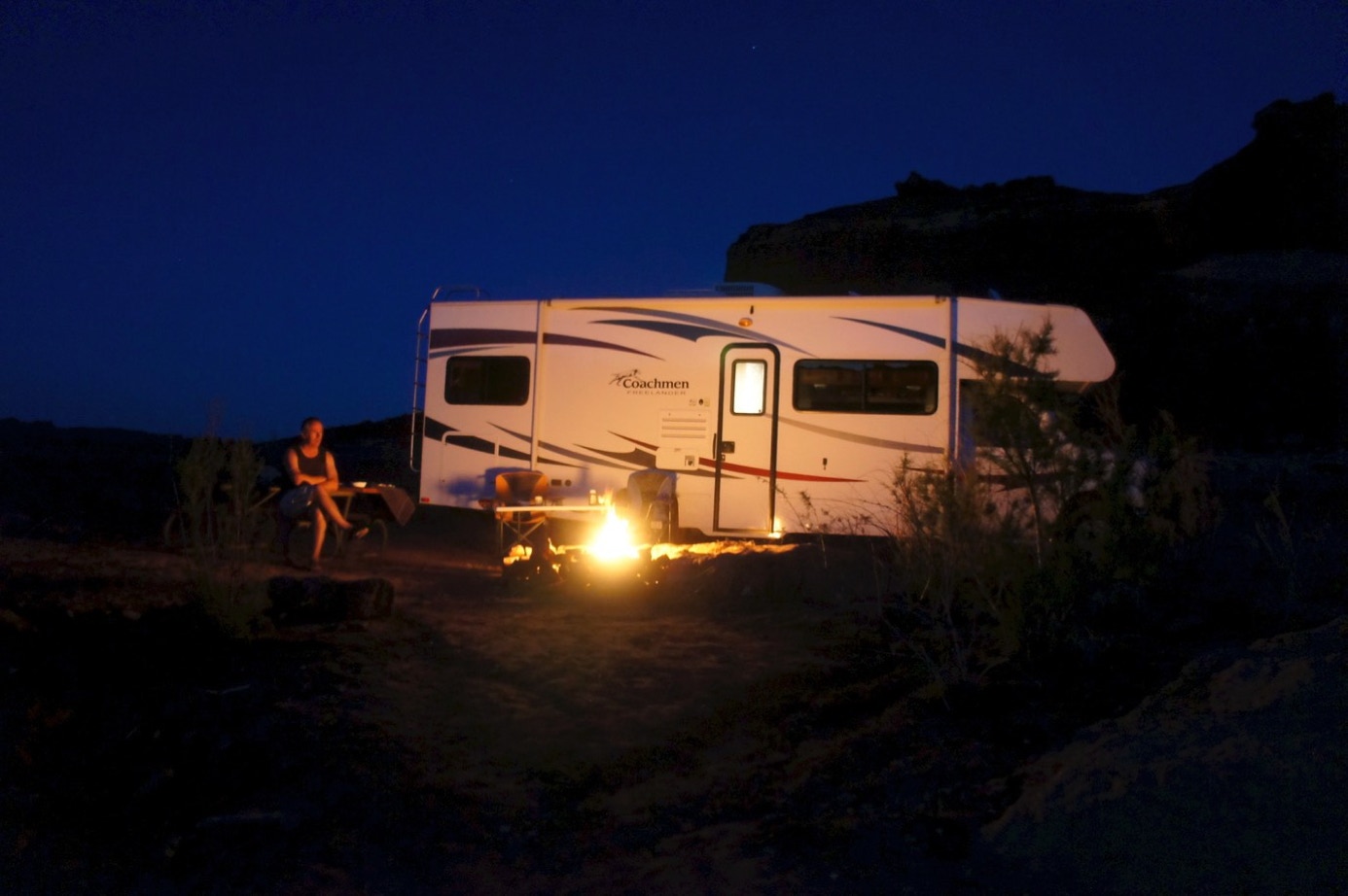 Maar als we na een uur bij Dead Horse aankomen staat er een bordje: campground full. Oke, dan door naar Canyonlands en kijken of er daar nog plek is op de campgrounds in dat park. Maar helaas de ranger daar zegt dat deze ook vol zijn. Er is hier nog één mogelijkheid en dat is Horsethief campground, waar we op de heenweg richting Canyonlands langsgereden waren. Dus terug richting Horsethief. En die is nog praktisch leeg. Daar kunnen we rustig ons plekje uitzoeken en ons installeren. Het lijkt overigens of die kl..te muggetjes met ons meegereden zijn, want hier vliegen er ook een flink aantal rond. En een paar opdringerige wespen. Maar die verdwijnen straks wel als de zon ondergaat.