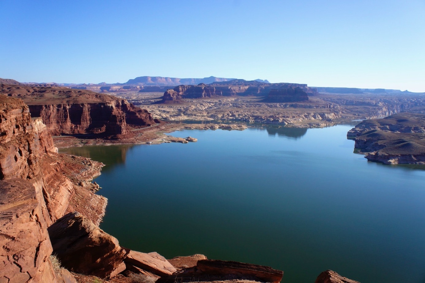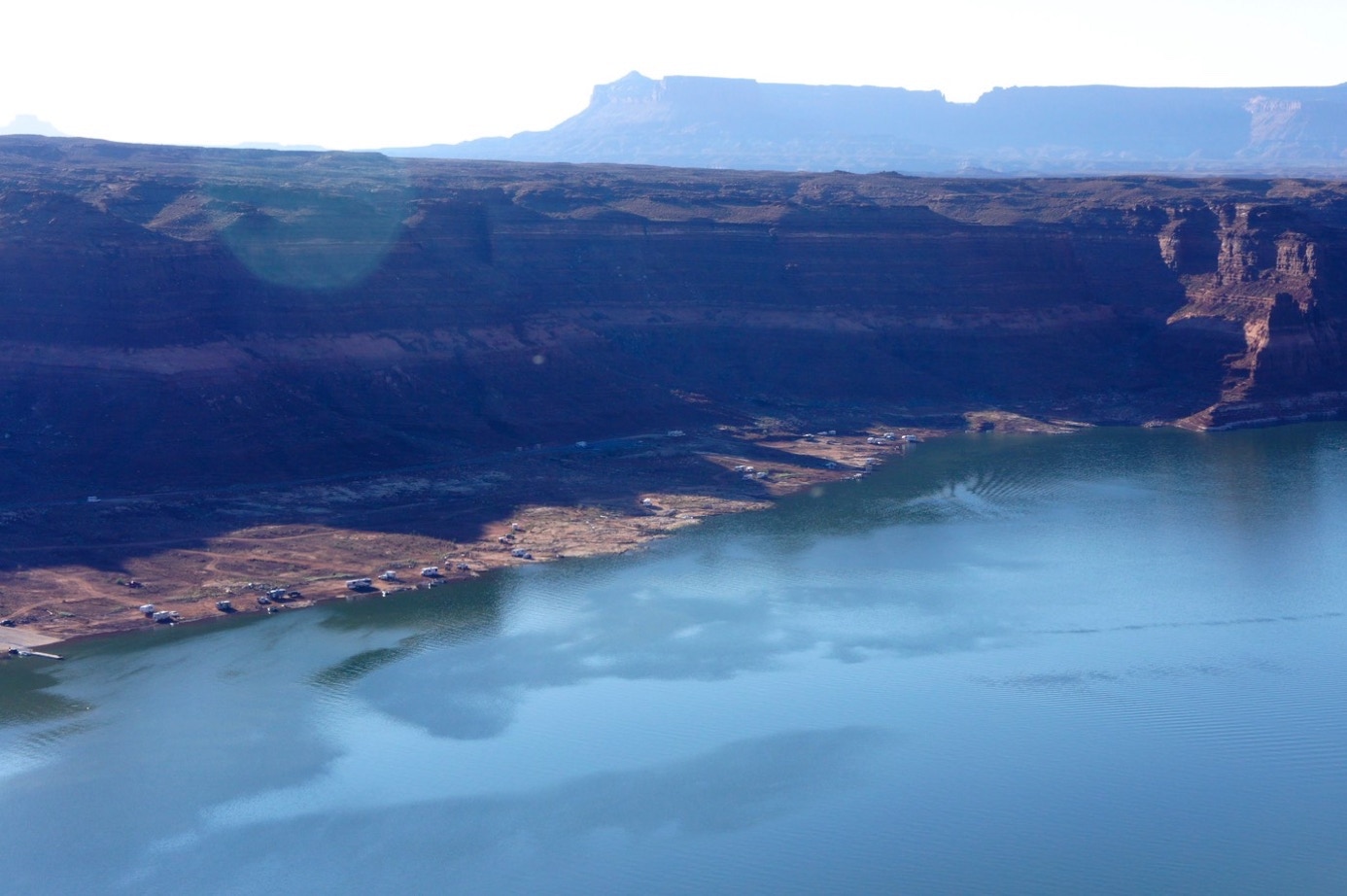 De volgende dag zijn we weer te laat voor de zonsopgang over Lake Powell. Maar allah er komen er nog meer. Vandaag gaat de rit naar Green river State Park, waar we op de state park campground willen bivakkeren. Eerst rijden we om Lake Powell heen naar een viewpoint waar we kunnen kijken op de plek waar we gestaan hebben We zien daar dat onze buurmannen alweer voor een volgend vistochtje over het meer vertrokken zijn. Het uitzicht op de omgeving is hier geweldig.
