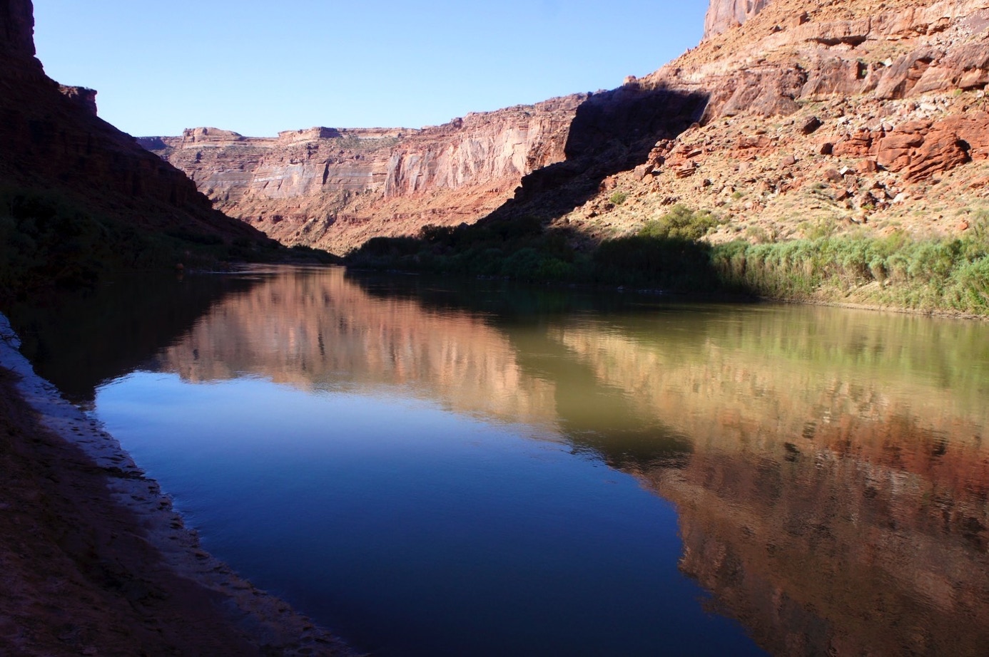 En daarna naar de camping waar we vorig jaar de originele Rodeo hebben meegemaakt. Helaas: vol. Er is namelijk een hondenshow. Op zoek naar een andere campground. Eerst maar eentje in Grand Junction zelf nog. Maar dan laat Tom-Tom het weer eens afweten. Stuurt ons naar een plek waar geen campground is te ontdekken. Oke, niet voor een gat te vangen op naar een campground in het Statepark Colorado river island acres. Pal langs die I70, dat wel. Maar met nog volop plaatsen en langs de Colorado-rivier alweer. Hoe kan het ook anders met zo’n naam. En aan de andere kant van de rivier staan ook weer bergen waarop, volgens een bord langs een wandelpad, commonly Big-horn sheep worden waargenomen. Maar niet vandaag. Niet nu wij er zijn. Een amerikaan laat ons nog weten dat hij ze “before” hier al wel eens gezien heeft. Ja, oke, maar nu zijn ze er niet. Tenminste wij zien ze niet. Maar we hebben ook geen idee hoe groot die beesten op zo’n helling te zien zijn. Misschien zijn het wel alleen maar stipjes.