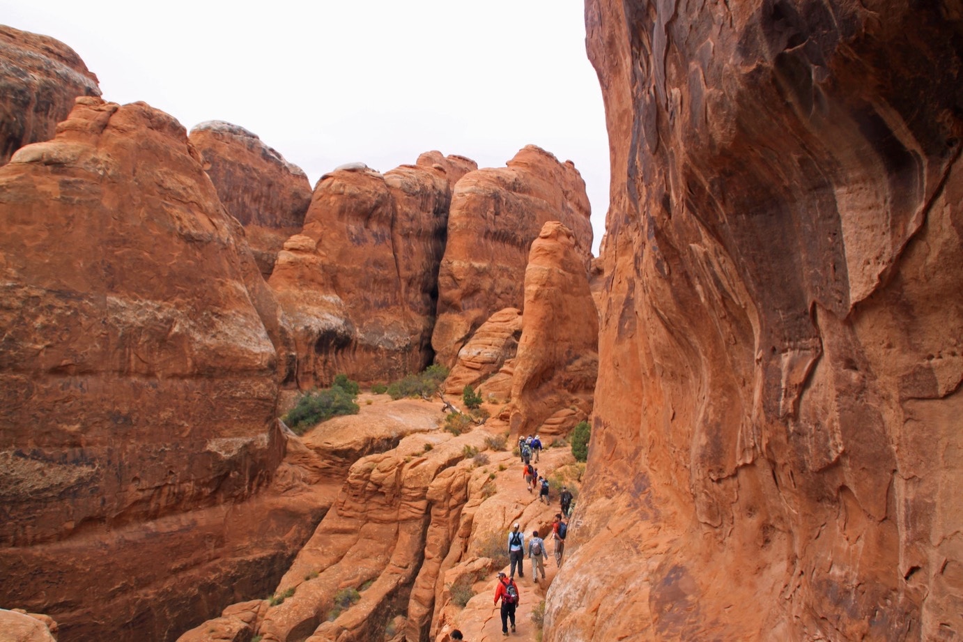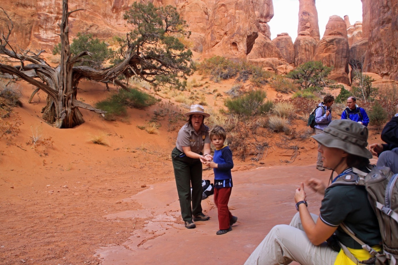 Omdat Arches maar een kwartiertje rijden is doen we op ons gemak. Eerst maar weer even koffie halen bij Starbucks en dan op weg naar Arches. Daar langs bij het Visitor-center om te horen waar we moeten zijn. We krijgen te horen dat we 5 à 10 minuten van te voren (10 uur) bij het viewpoint van Fiery Furnace moeten zijn. En het is nog een half uur rijden (? Hadden we niet gedacht). En op dat moment is het 5 voor half tien. Dat wordt dus racen met de RV.