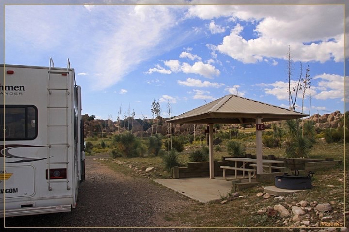 Zeer nette campground in het state park Valley of Fires (http://www.americansouthwest.net/new_mexico/valley_of_fires/recreation_area.html) Niet te verwarren met Valley of fire in Nevada. Dit park is een Lava tube. Er loopt een nature trail door. Zelf in het naseizoen was het hiet nog erg heet. De plekken zijn vlak (asfalt) met een overdekte picknicktafel. Ruim opgezet. In het lava zitten veel hagedissen.