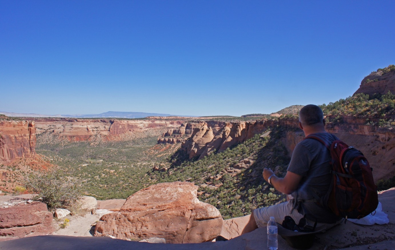 Dat doet het uiteindelijk voor ons. We besluiten de stoute schoenen aan te trekken (slippers zijn wat minder geschikt daarvoor), stoppen de rugzak vol met flesjes water en begeven ons op weg naar het dal. Nou gaat het wel naar beneden, maar we vorderen toch maar langzaam. Ik heb het gevoel dat ik minder last heb van mijn hoogtevrees (of de dieptes zien er hier wat minder schrikwekkend uit, dat kan ook). Maar we willen natuurlijk ook steeds van de omgeving genieten. Als we ongeveer 20 minuten op pad zijn komen we de Amerikaan weer tegen. Hij is al op de terugweg omdat hij het toch te warm vindt om veel verder te gaan. Wij vertellen hem dat we nog een klein stukje verder gaan en dan ook zullen omkeren. Na een half uur stoppen we, rusten in de schaduw even uit en keren dan om. En achteraf blijkt dat de stelregel klopt, dat je er op moet rekenen dat je twee keer zo lang er over doet om naar boven te gaan, als dat je naar beneden bent gegaan. We doen er dus een uur over om weer boven te komen.