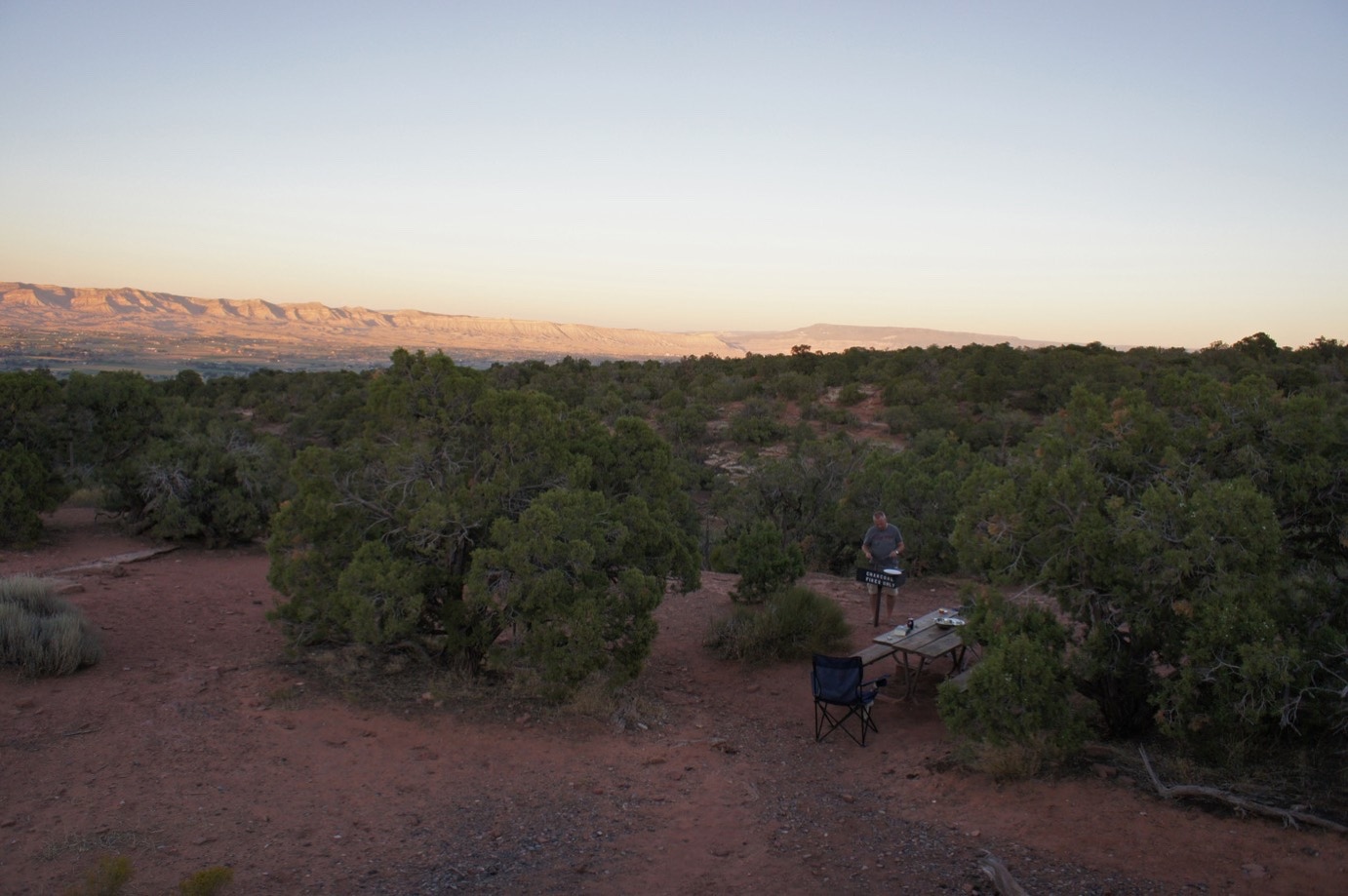 Dan is het tijd voor ons steakje op de barbecue en proberen we nog wat foto’s te maken van de maan en de sterren. Ìk ben er nog steeds niet achter hoe ik mijn camera zover krijg een tijdje zijn ene oog open te houden om daarmee voldoende licht binnen te laten om de sterren op de gevoelige plaat vast te leggen. En sterren zijn er genoeg op zo’n plek waar we stonden. Op een gegeven ogenblik geef ik het dan ook maar op. Daar kom ik nog wel eens achter. Waarschijnlijk op een van onze volgende Amerika-reizen.