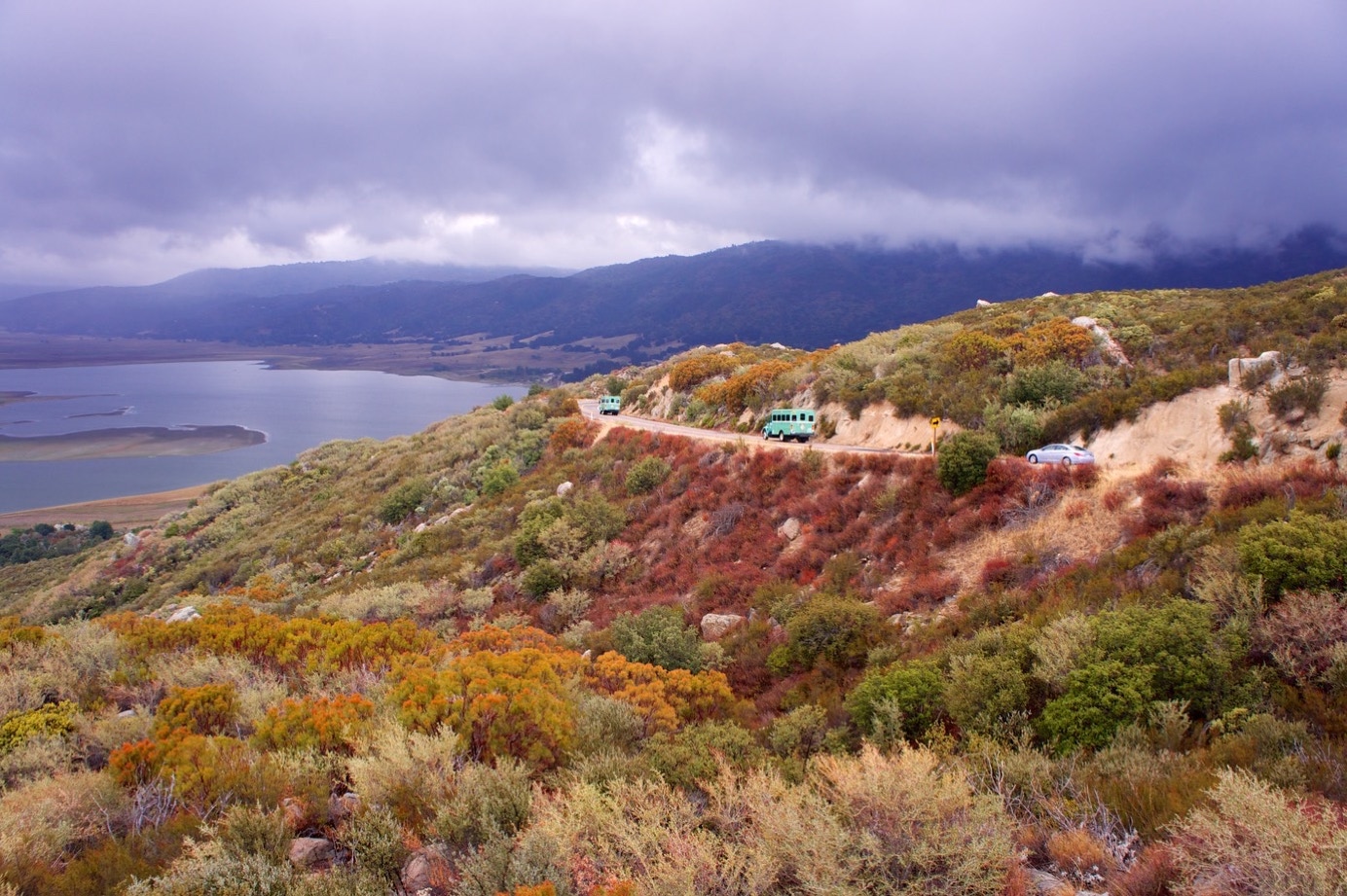 Halverwege deze rit, zien we uit de mist een afslag opdoemen richting Lake Henshaw. Die moeten we hebben en eindelijk begint de weg weer te dalen. Het is dan best wel een bijzonder moment als je ineens weer onder die wolken uit duikt. En dan zien we Lake Henshaw tussen twee bergen door liggen.