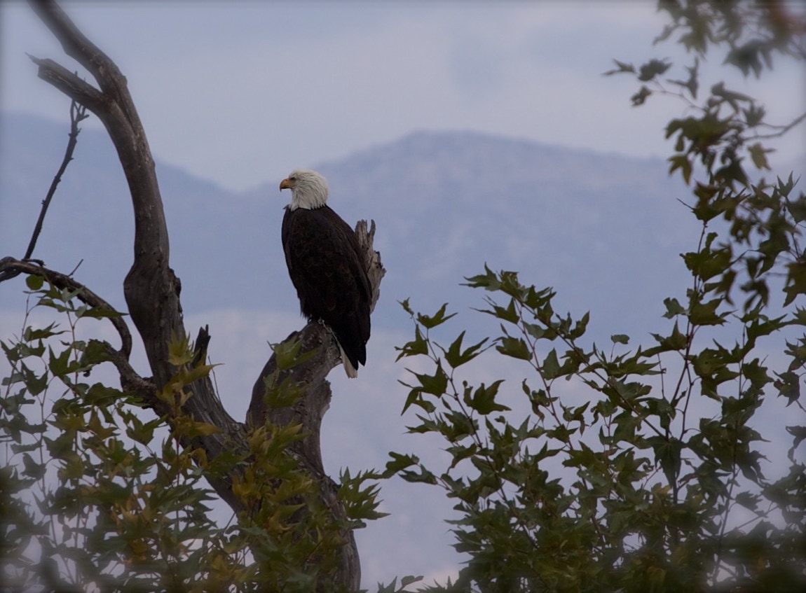 Een eindje verder zie ik iets wits in een boom zitten en zeg dat tegen Marja en daar kunnen we weer een specimen aan onze lijst van wild toevoegen: de Bald Eagle. Met “doodsverachting” gooi ik de camper op een eigenlijk te smalle plek langs de weg om samen uit te kunnen stappen om de Eagle te kunnen filmen en fotograferen. En dat zijn weer een paar mooie plaatjes geworden.