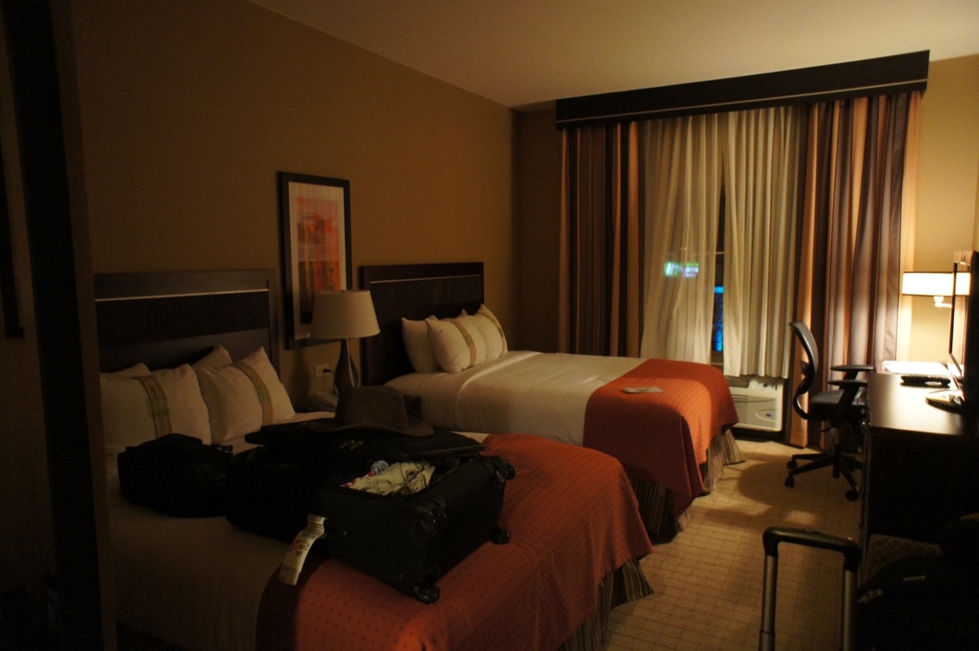 Even later brengt de shuttle van het hotel ons naar het hotel. We zitten in het holiday inn suites & rooms, gewonnen via priceline voor 50 dollar. De receptioniste regelt gelijk voor ons een taxi voor 8.00 uur de volgende ochtend. De kamer is prima in orde. We zetten de koffers neer en lopen naar het restaurant waar we dus om 21.30 uur plaatselijke tijd een pizza bestellen. Let wel!! Dit is dus 6.30 uur Nederlandse tijd. Ach je ziet wel, we wennen al snel. Hierna gaan we terug naar onze kamer, we zijn inmiddels meer dan 24 op, en eigenlijk best wel moe.