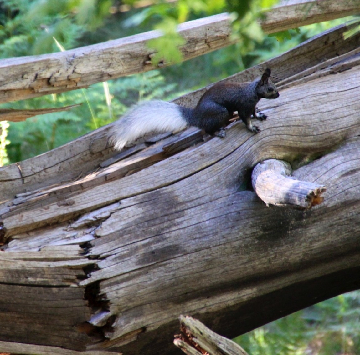 Op de terugweg van de Lodge proberen we eerst een foto te maken van een vliegensvlugge chipmunk (je weet wel Knabbel en Babbel). dus dat valt niet mee. Maar Marja slaagt erin de little bugger vast te leggen, ook al is het wat in de schaduw. Maar goed dit is maar “weer” eens een chipmunk. Verderop zien we ineens een eekhoorn die we nog niet eerder gezien hebben. Een donkergrijs lichaampje met een grote witte pluimstaart. Ook dit beest springt van tak tot tak en is nauwelijks te volgen. We staan bijna zelf ook als een eekhoorn heen en weer te springen om hem goed in beeld te brengen. Maar uiteindelijk lukt dat toch wonderwel. Dus weer een nieuw species toegevoegd aan ons lijstje. Misschien hebben we wel een nieuwe soort ontdekt.