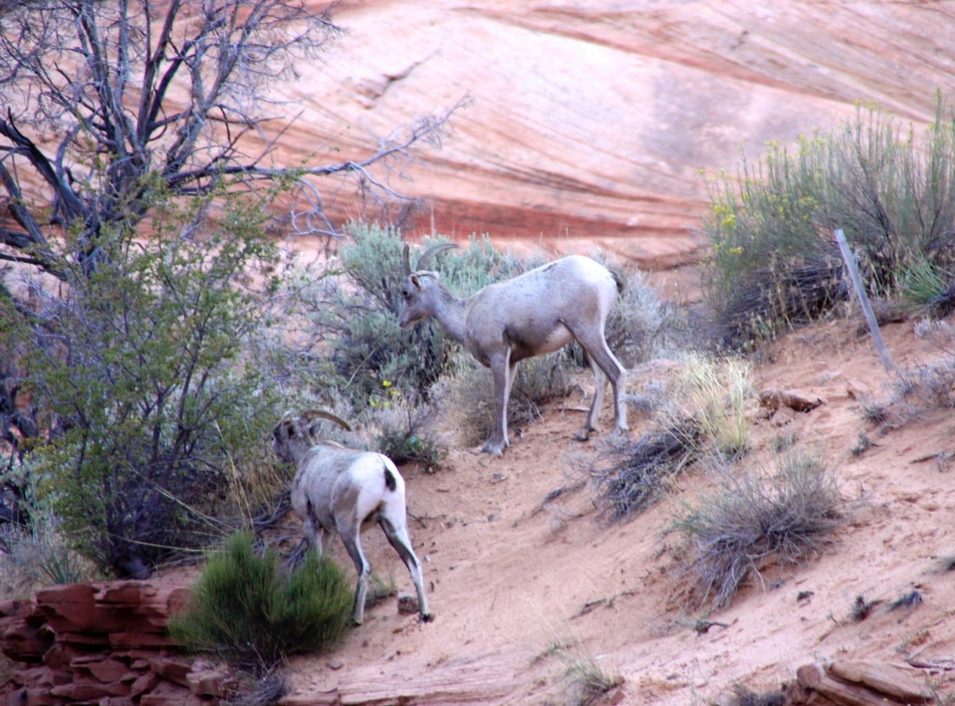 Vlak na de tunnel stoppen we even omdat de binnenkant van de vooruit met laagstaande zon bijna ondoorzichtig was. En dat is met bochtige wegen, met diepe putten langs de weg niet zo handig als je ineens niets meer ziet. Een auto die voor ons staat rijdt weg, maar stopt een eindje verder weer en de chauffeur stapt uit. Eerst hebben we niet door waardoor, maar dan ziet Marja ineens dat er een kleine kudde mountain bighorn sheep of bighorn mountain sheep rondlopen. Een mannetje en een stuk of vijf, zes vrouwtjes. We lopen er snel naar toe en Marja maakt wat foto’s. Als we daarna met onze camper wegrijden staan ze nog steeds langs de weg. En als we er vlakbij zijn komt ook het mannetje (met die grote horens), dat even was weggerend, weer terug. Waarschijnlijk om die vrouwtjes mee te tronen. We rijden heel langzaam erop af en Marja roept wacht, wacht. Maar omdat er een aantal motoren achter me rijden rijdt ik heel langzaam verder. Helaas zijn de foto’s daardoor allemaal een beetje bewogen.