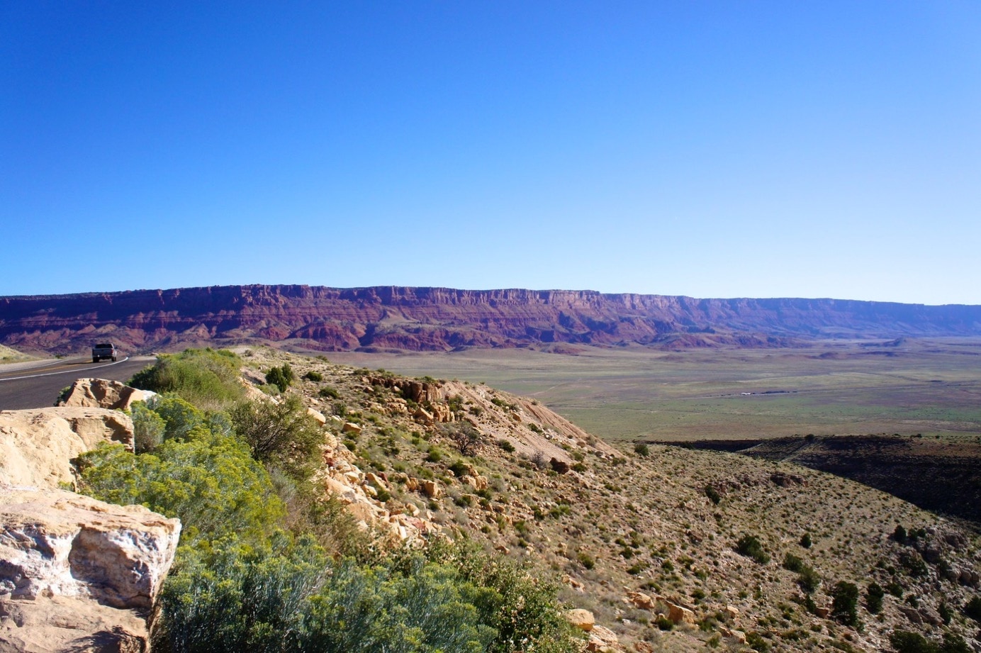 Verder op weg naar Lees Ferry. Een plek aan het eind van de wereld of misschien beter gezegd een onaardse plek. Nadat we bij Jacob Lake de benzinetank weer hebben gevuld dalen we eerst af naar 1500 meter en genieten we van het zicht op de schitterende Vermillion Cliffs en van het uitzicht over het dal, waar je de weg die we moeten rijden al mijlenver kunt volgen.