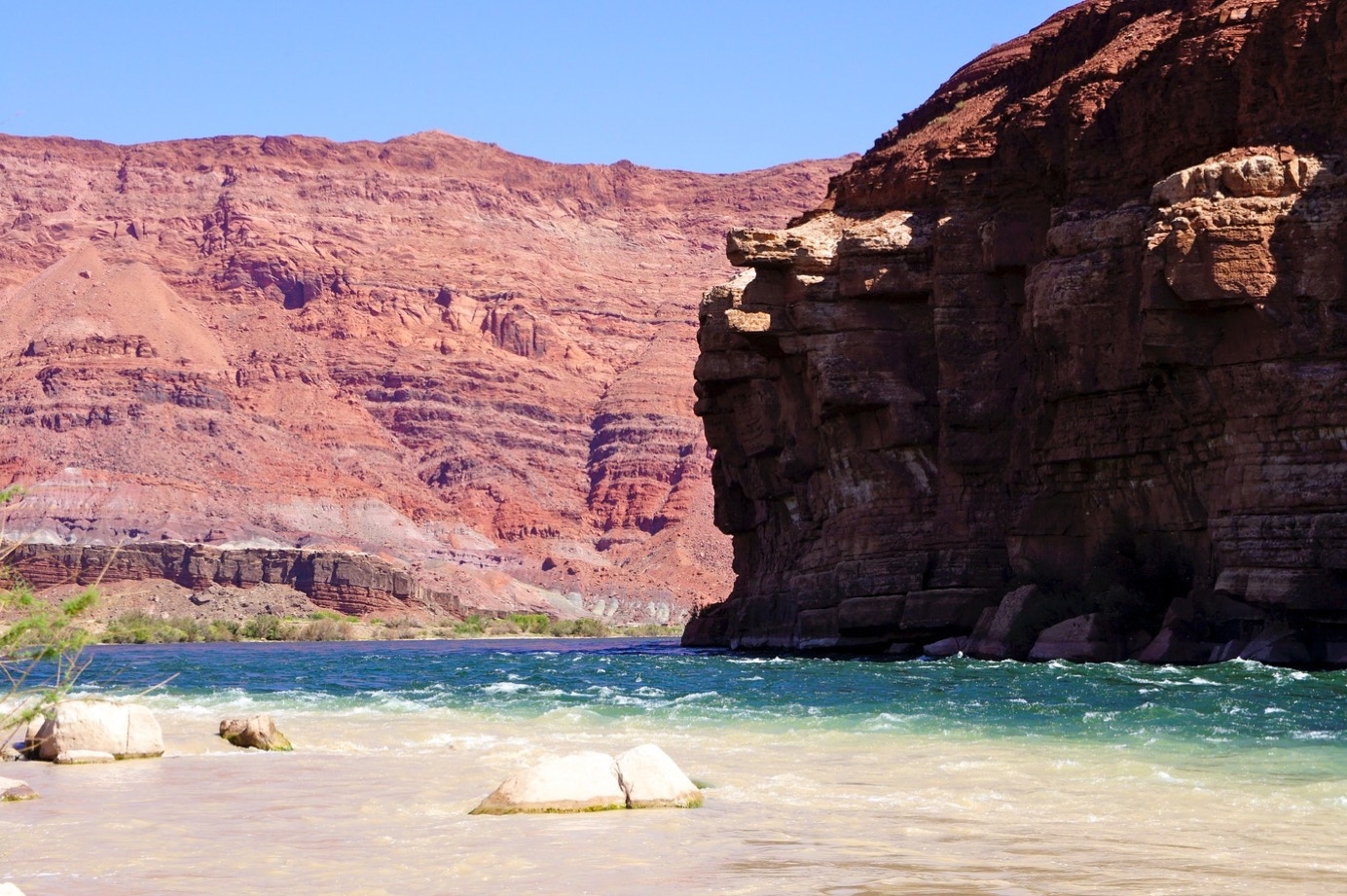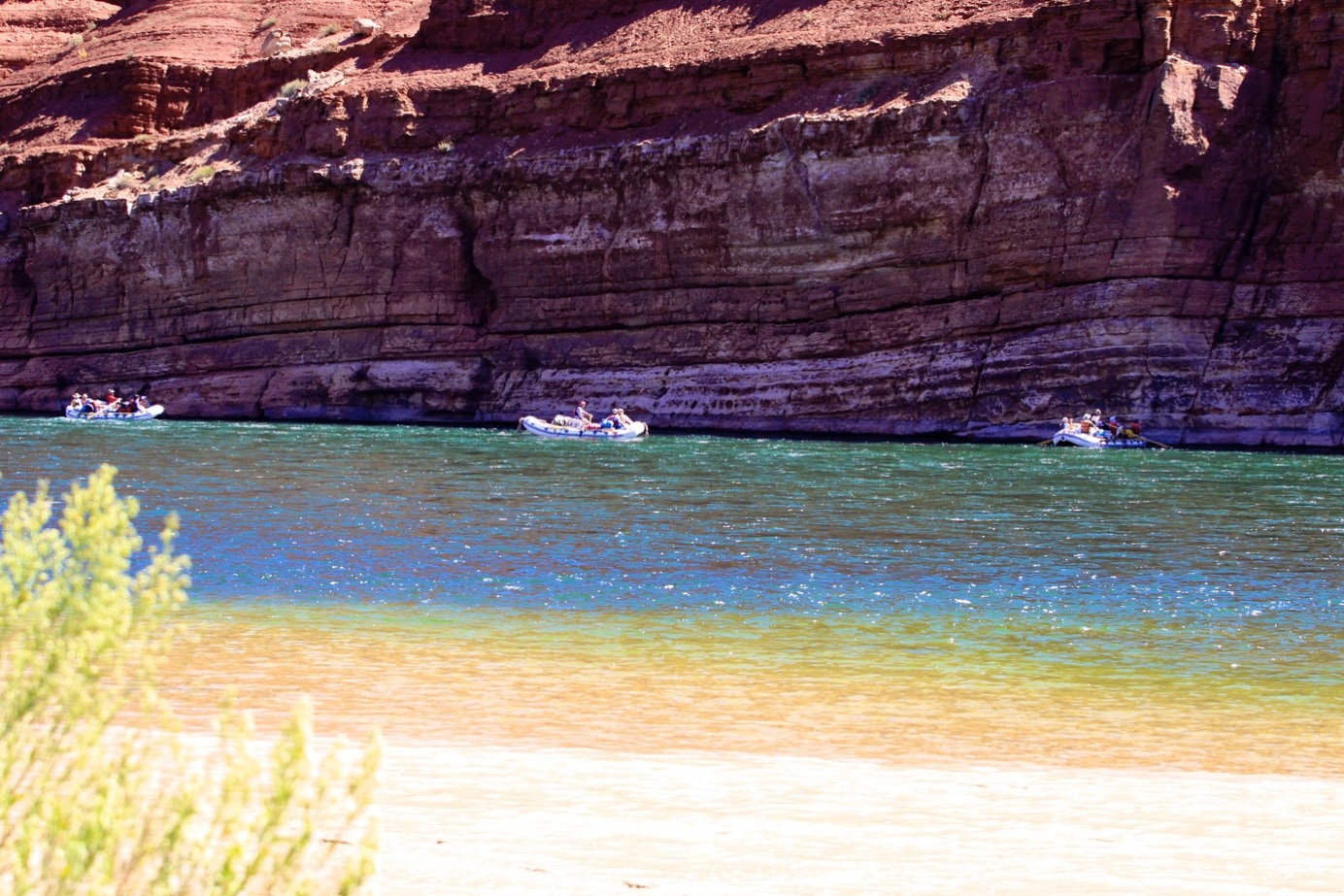 Als we gesetteld zijn lopen we eerst even naar beneden, naar de Colorado-rivier die hier op een paar honderd meter van de campground stroomt. We zien ook een aantal rafters van start gaan voor tochten van wel 280 mijl en die drie weken duren. Maar dan moet je wel een beetje kunnen raften, want ze komen dan aardige stroomversnellingen tegen. Als we klaar zijn met pootjebaden in de Colorado-rivier gaan we een tijdlang lekker bij de camper in de schaduw zitten, want het is inmiddels aardig heet geworden met zo’n 32 graden. We lezen allebei wat in onze E-reader. De mijne liep overigens gister vast, dus moest ik iets heel kleins vinden om hem te kunnen resetten. Dat lukte uiteindelijk, maar op dezelfde bladzijde in het boek dat ik aan het lezen was liep ie weer vast. Dus toen heb ik dat boek maar van mijn reader verwijderd en ben ik in een ander boek begonnen.