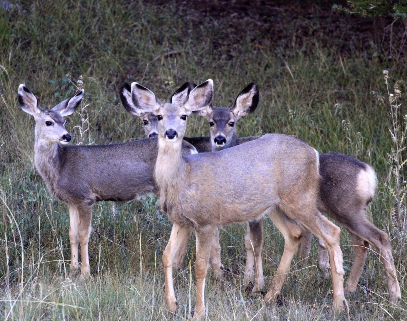 Grand Canyon North Rim ligt achter ons. Nadat we onze watertank hebben bijgevuld en het vuile water hebben gedumpt, rijden we om ongeveer kwart over zeven van de campground weg. Op weg naar weer een geweldige dag. De lucht is al weer strak blauw en het lijkt of er wat rijp op de velden langs de weg ligt. Maar dat weten we niet zeker. We moeten eerst een eind terug rijden (40 mijl ongeveer) naar Jacob Lake. Geen probleem want de omgeving is weer een plaatje. Alleen zou je in een omgeving als deze toch wat meer wild-life verwachten. En afgezien van een bord dat ons belooft dat we bisons zullen zien, komen we binnen het Grand Canyon Park niets tegen. Pas daarbuiten zien we een paar verdwaalde herten. Tot we ineens op een hele kudde stuiten. Gelukkig is het nog vroeg en dus nog erg rustig op de weg, dus ik kan makkelijk stoppen aan de kant, zodat Marja de gelegenheid krijgt een flink aantal foto’s te maken.