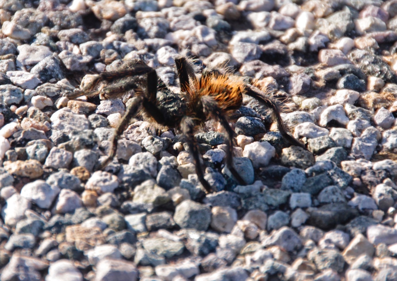 Zoals bijna elke dag willen we vroeg rijden, omdat we dan de meeste kans hebben om wild te zien. Vandaag lukt dat ook. En wat voor een “wild”. De eerste mis ik maar net, maar het is te laat om te stoppen. Bij de tweede kan ik stoppen. Marja springt uit de auto, maar kan niet snel genoeg scherp stellen voordat er auto’s van de andere kant komen. En dan is het te laat: het “wild” wordt door een tegemoetkomende auto geplet. Bij de derde lukt het wel: de tarantula is al bijna aan de kant van de weg als we hem spotten. Opnieuw springt Marja uit de auto en maakt een paar aardige foto’s van dit toch wel bijzondere beestje.