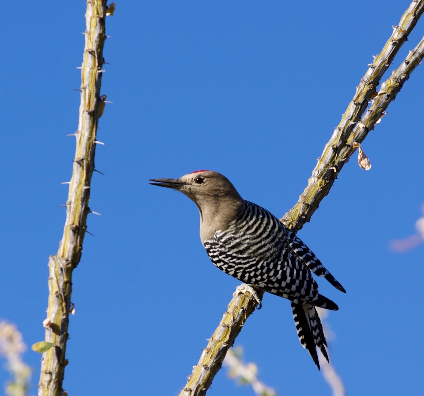 Als we vanochtend lekker buiten zitten te ontbijten, nadat we vrij laat voor ons doen wakker geworden zijn, worden we verrast door een bezoek van Woody Woodpecker (alleen de coyote ontbreekt nu nog).