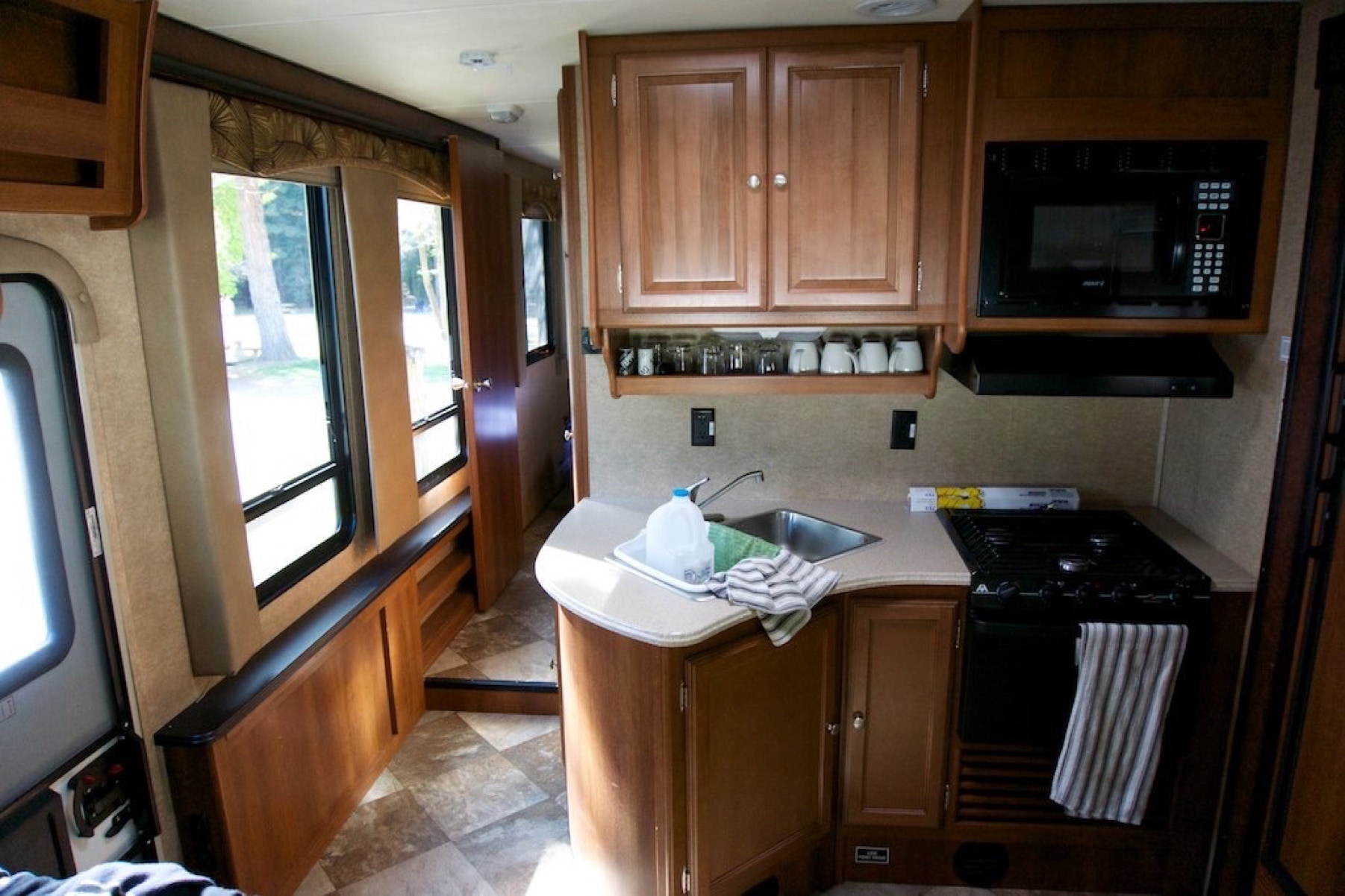 Na het doen van de boodschappen krijgen ook deze spullen een vaste plek in de camper. Ook hier is genoeg ruimte voor. En dat is dan punt 2. De camper is voorzien van een koelkast, een ruim vriesvak, een magnetron, een gasstel, een toaster, een koffiezetapparaat (de laatste twee zijn geloof ik Roadbear specifiek) en vaak ook nog een oven. Je hebt dus alles bij de hand. Kunt overal waar je bent een maaltijd bereiden, koffie zetten, koud drinken pakken of zelfs een ijsje uit de vriezer halen. Je bent dus van alle gemakken voorzien. Ben je bezig een mooie route te rijden en zie je een leuke/mooie plek om te stoppen dan kun je zo met prachtig uitzicht je stoeltjes en tafel buiten zetten, de luifel uit doen en op het gemak lunchen of gewoon rustig zitten en wat drinken.