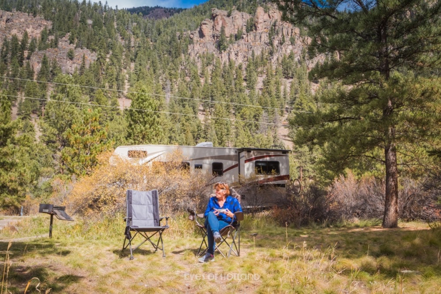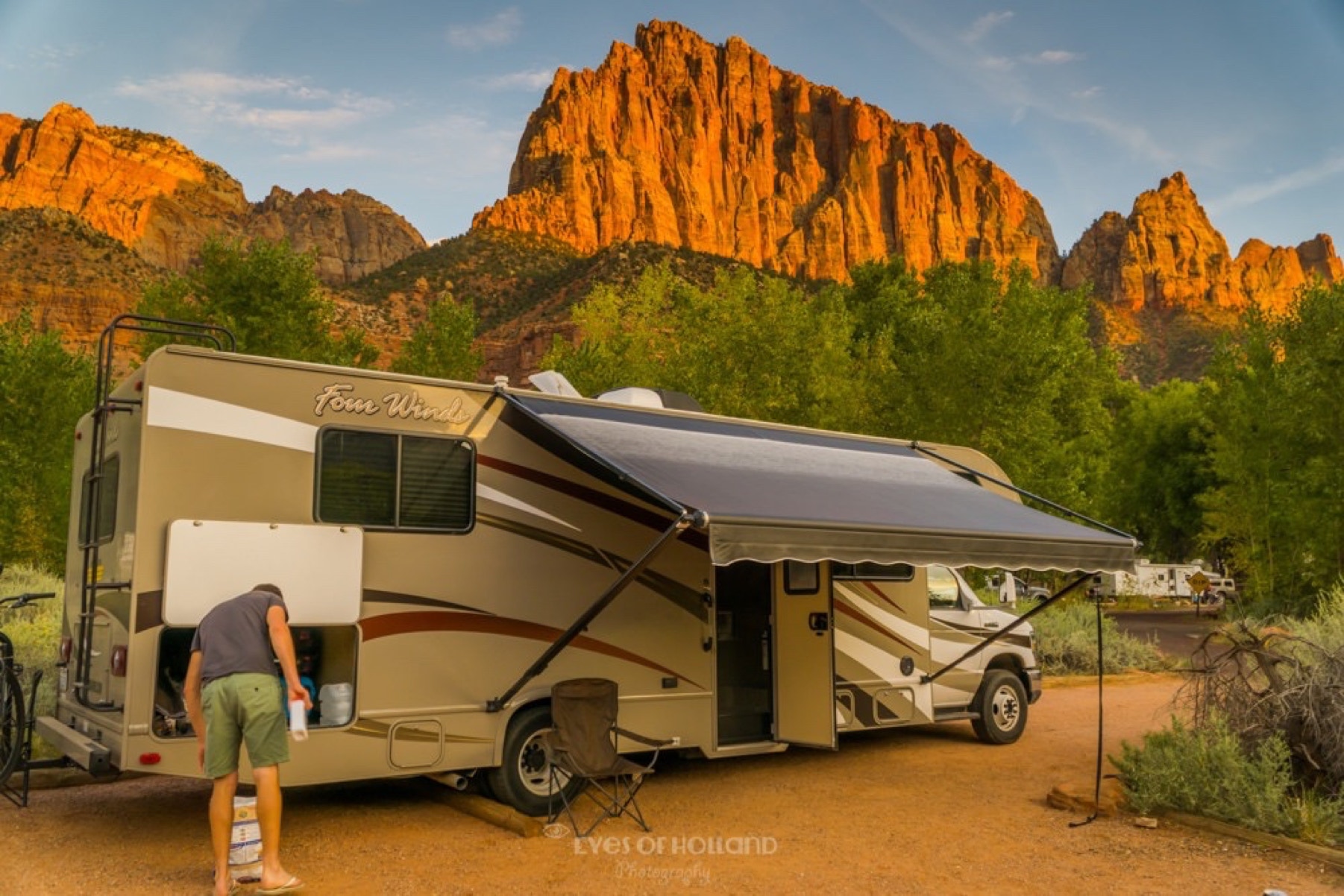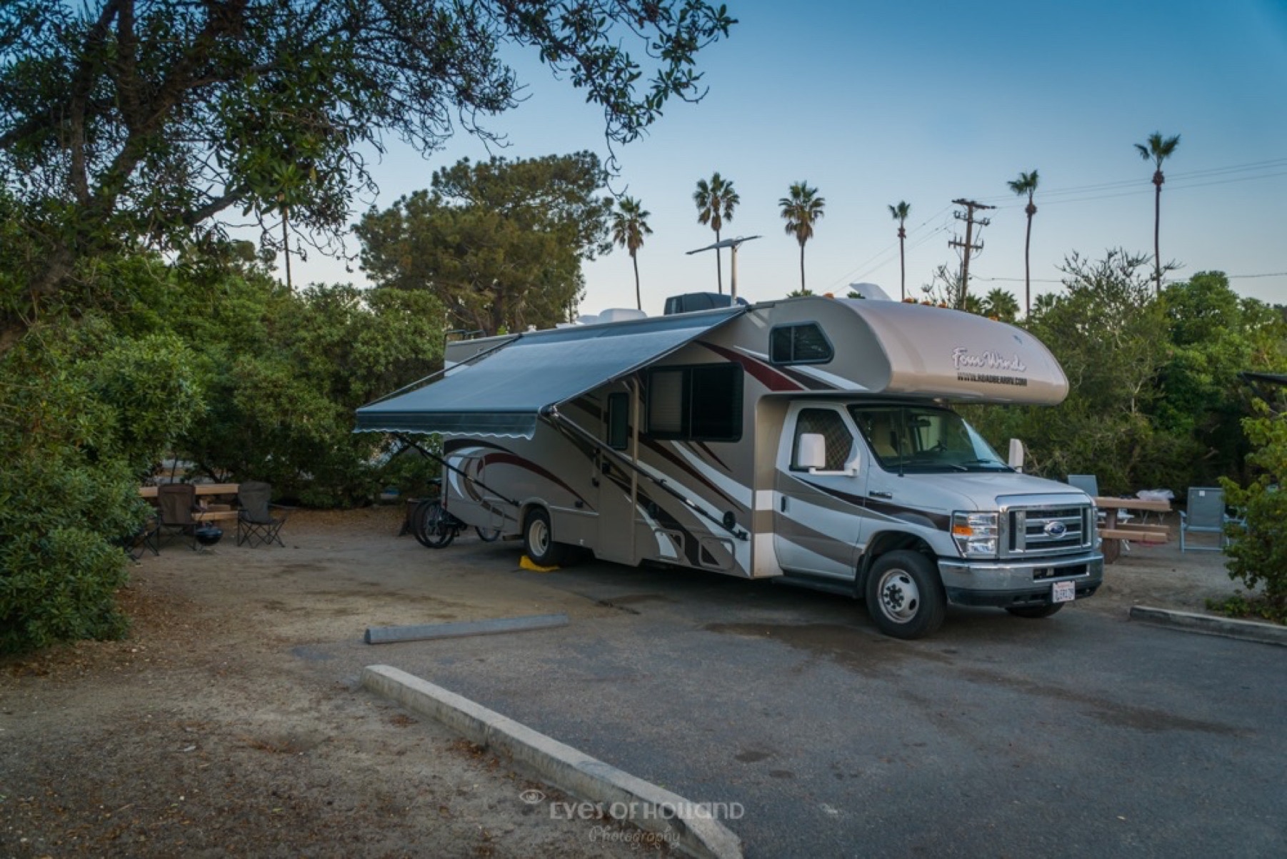 Nog even over het kamperen en campings. Bij onze eerste reis had ik geen idee wat ik me voor moest stellen bij een camping. De schrikbeelden van europese campings, overvol, hele families bij elkaar, rondrennende en schreeuwende kinderen. Dat zag ik echt niet zitten. Maar in Amerika vind je deze campings niet. Er zijn heel veel kleine natuur campings, zonder faciliteiten (die heb je ook niet nodig, want je hebt alles zelf bij je) er zijn KOA’s en er zijn RV parken. Zelf houden we niet zo van de RV parken. Deze zijn luxer, hebben wel mooie vlakke plaatsen, vaak een zwembad, soms zelfs iets van animatie. Hier vind je de grote bussen waarmee de Amerikanen zelf rondrijden. Sommige plekken hebben een eigen patio met schommelbank en buiten keuken. En vaak luxe sanitair.