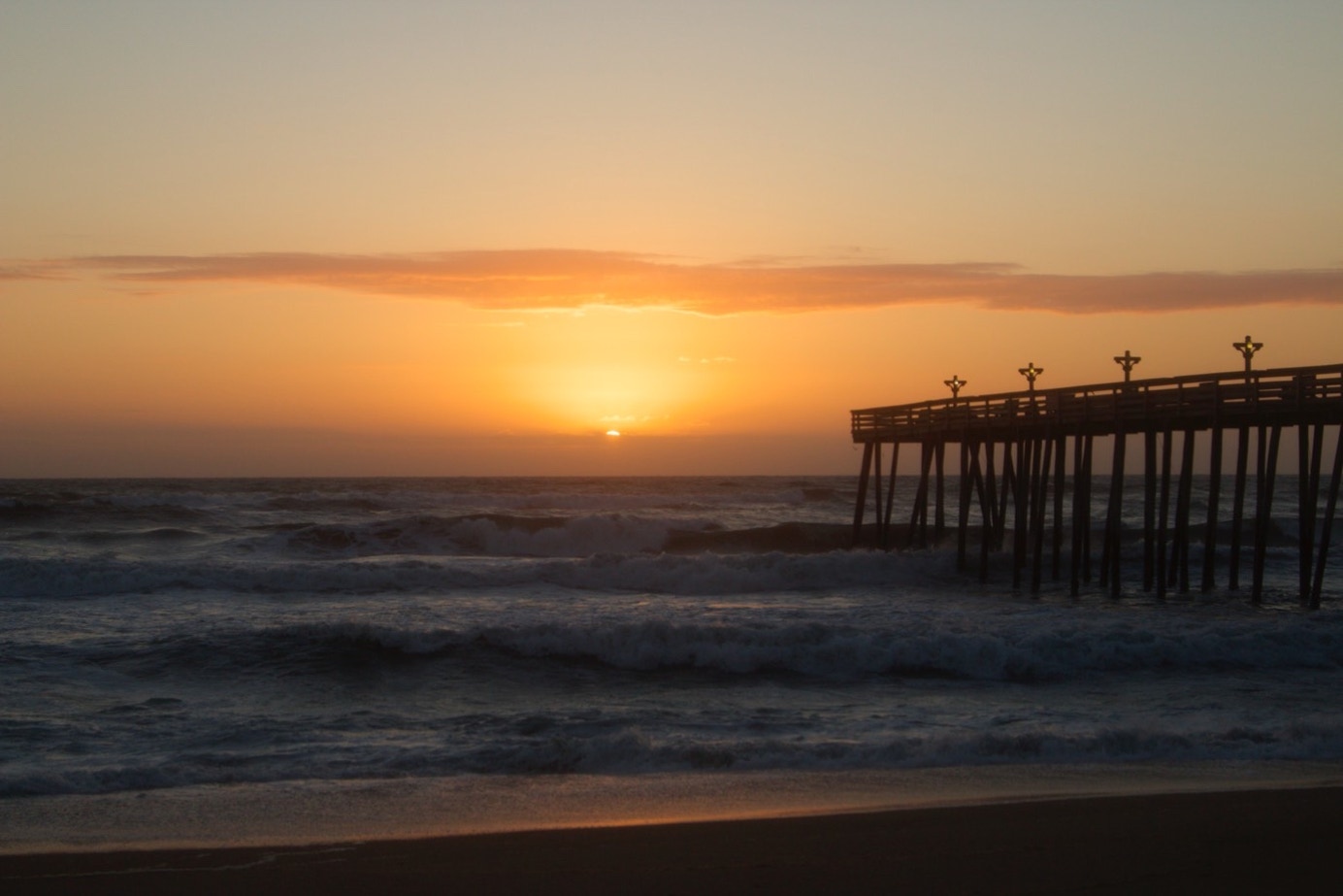 Vanochtend zie ik de pier ook van dichtbij. Om kwart over zes al. Het lijkt alsof hij met stukken hout en grote bouten aan elkaar gezet is. En het waait nog steeds erg hard, storm eigenlijk. En koud dat het is. We wagen ons dus maar niet op de pier en wachten de zon af.