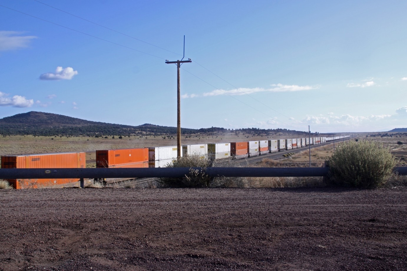 Wel worden we getrakteerd op het toch wel spectaculaire zicht op de goederentreinen in Amerika. Langs Route 66 lopen kennelijk gelijk op sporen waarover nogal wat goederenvervoer plaats vindt. De eerste keer dat we zo’n trein zien kunnen we onze ogen bijna niet geloven. Vier locs trekken misschien wel 40 of 50 wagons. Marja probeert hem te filmen, maar we zijn eigenlijk net te laat als de trein onder een brug door verdwijnt. Even later halen we de trein weer langzaam in en ik doe mijn best om hem een stukje voor te komen. Dan kunnen we stoppen en kan Marja hem nog een keer filmen. Dat lukt (net aan) en na een soort noodstop springt Marja uit de camper, stelt de camera in en filmt de langs rijdende trein. Uiteindelijk levert dat een paar minuten film op.