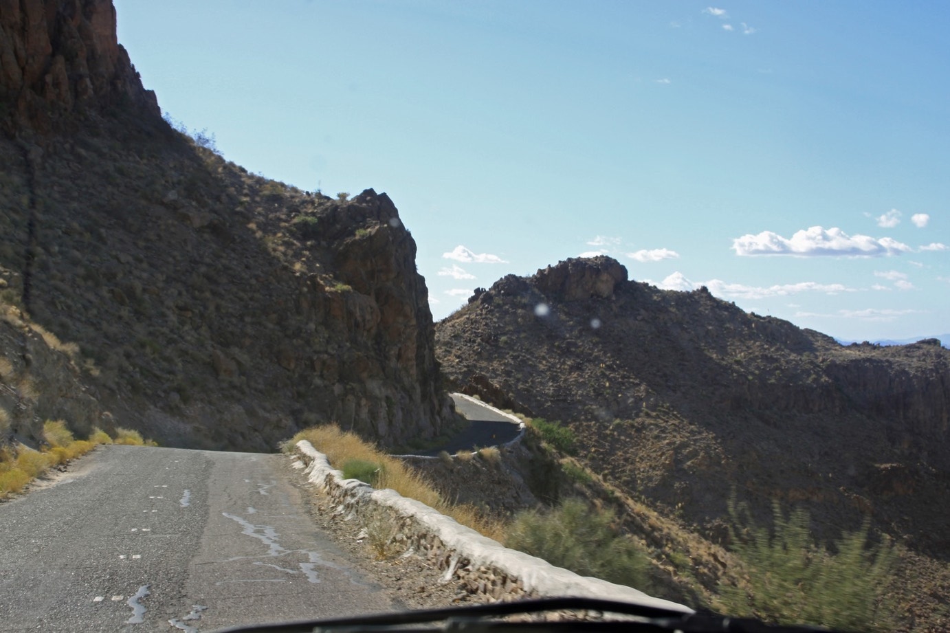 Maar wat een weg. Nauwelijks twee auto’s breed. Brokkelige randen aan de weg, met nauwelijks of geen berm en redelijk diepe afgronden. Dat levert dus een paar benauwde momenten op met (gelukkig maar een paar) tegenliggers . Zeker als Marja in de zijspiegel ziet dat de achterband af en toe bijna over het randje hangt. We slingeren ons met een gangetje van 15 miles per uur om hoog (wat ook de adviessnelheid is). Soms bij hele scherpe haarspeldbochten zelfs teruglopend naar 10 miles per uur. Het zweet staat in mijn handen en Marja vergeet bijna foto’s te maken van de weg en de omgeving.