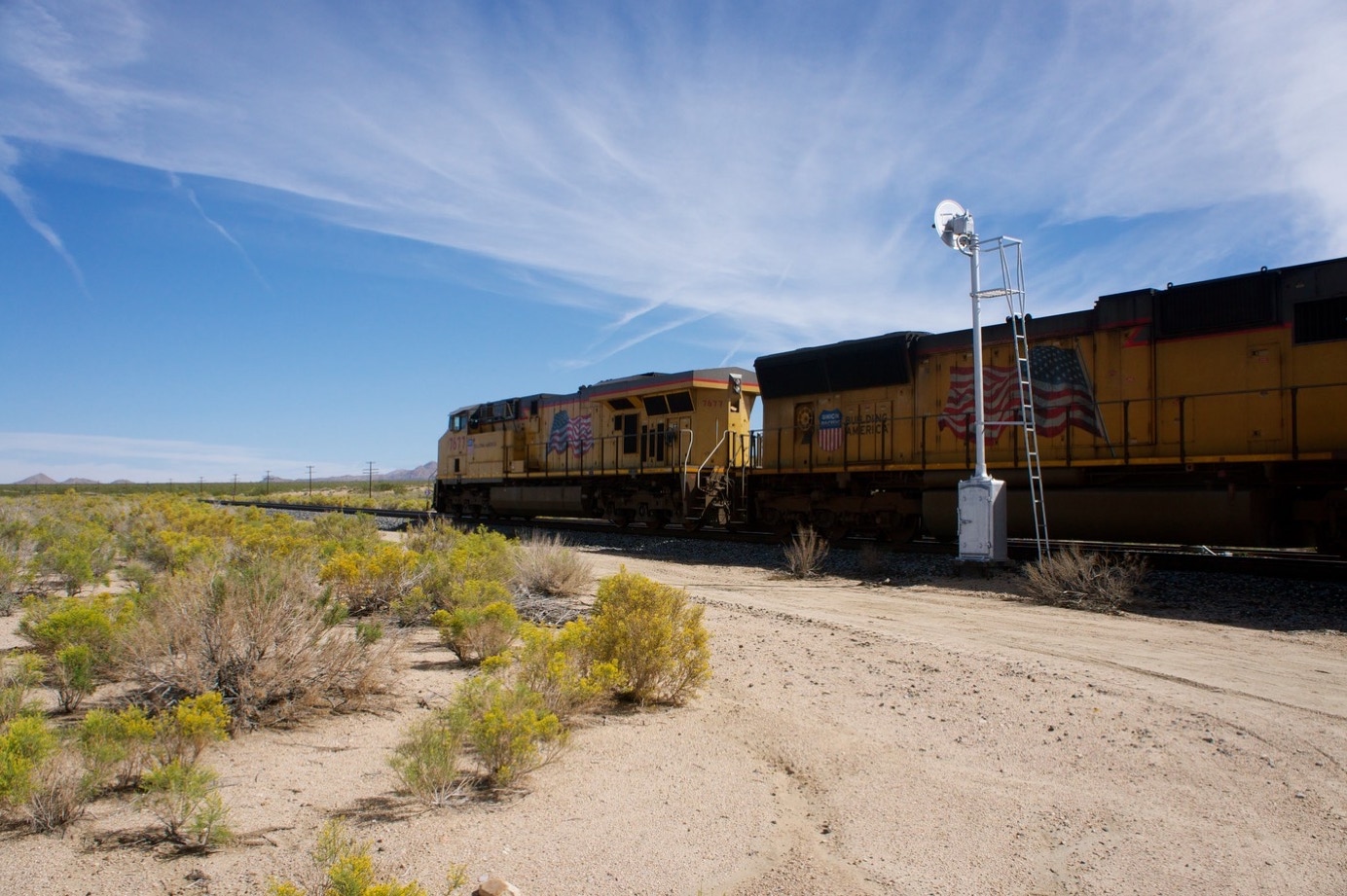 Tijdens deze rit worden we ook weer een paar keer getrakteerd op het imposante schouwspel van die treinen die hier met een slakkengangetje door het landschap rijden. Treinen met vaak drie tot vijf locs ervoor en rond de honderd wagens daar achter. Toch worden zelfs dit soort treinen in een gebied als waar we nu doorheen rijden tot speelgoedtreintjes, waarbij je soms nog heel goed moet kijken om ze te zien.