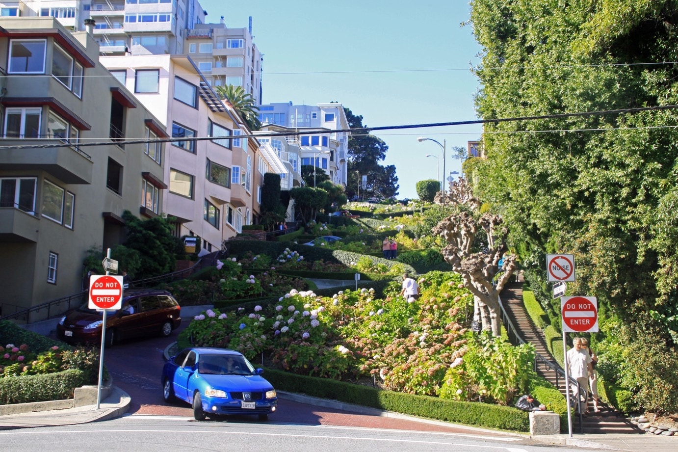 We komen terecht in de car die langs Lombard-street rijdt en die moet je toch ook gezien hebben als je in San Francisco bent geweest. Zoals we wel vaker meegemaakt hebben is er ook net één of twee busladingen mensen uitgelaten. Dus het duurt even voordat we aan onze foto’s toekomen.