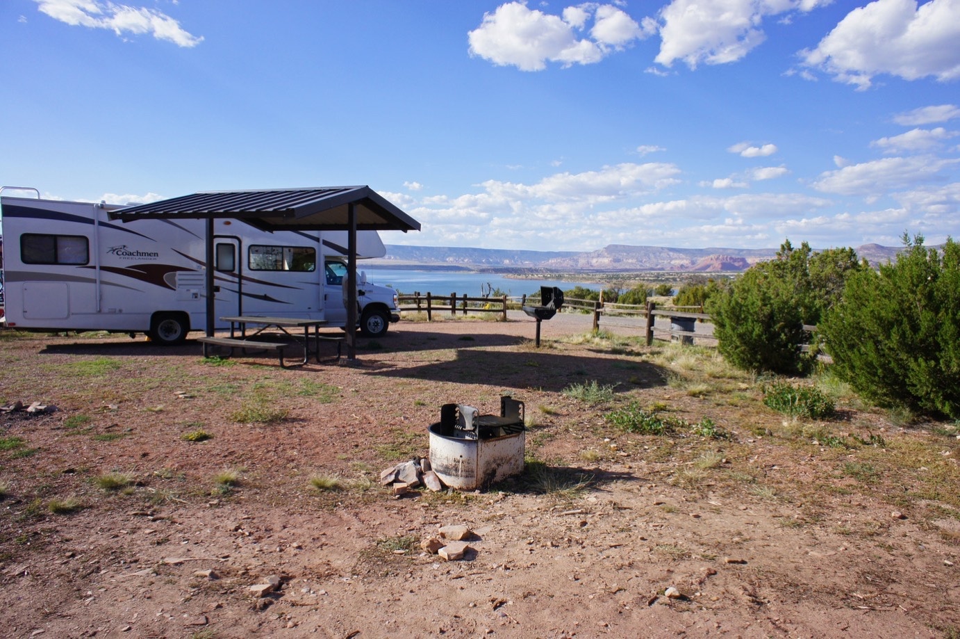 Tot slot geeft ze ons nog wat aanwijzingen om bij het meer te komen. En als we de camper hebben gestald, lopen we inderdaad even naar beneden. Daar zitten we een tijdje aan de rand van het koude meer (het is een stuwmeer bij de dam van Abiquiu, hoe kan het anders?). Daarna weer terug naar de camper waar we de kooltjes opwarmen en een paar kipfiletjes braden, die we daarna heerlijk oppeuzelen met wat rijst er bij.