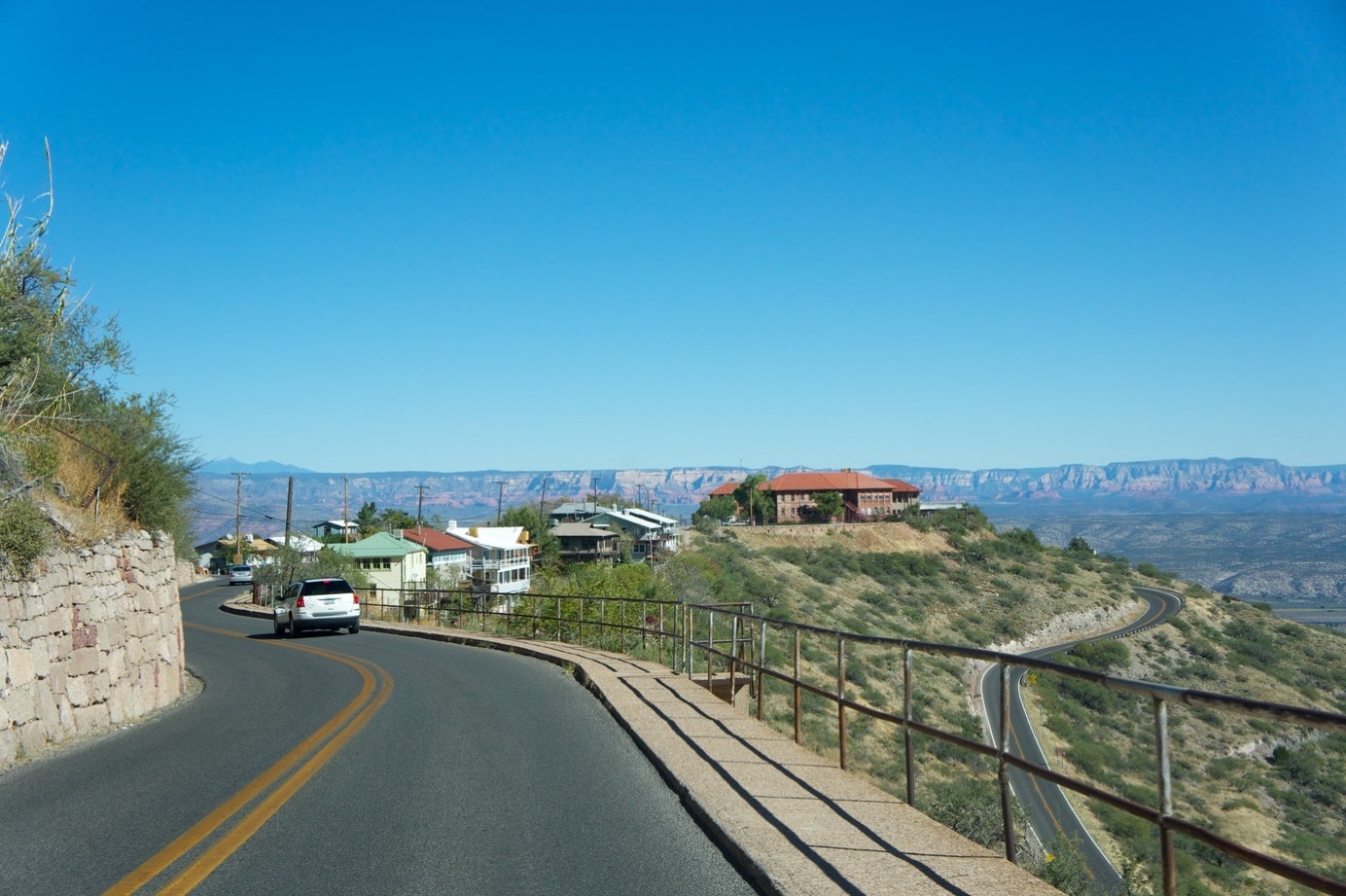 Op weg daar naar toe doen we ook nog Jerome aan. Een oud mijnwerkersstadje, dat helemaal was leeggelopen en een ghosttown was geworden, maar inmiddels - eerst door kunstenaars, zoals je hier wel vaker ziet gebeuren - weer bewoond is en een toeristische attractie is geworden. De weg erheen is weer lekker bochtig en redelijk rustig. Alleen in Jerome is het nogal druk. Bovendien is het een tegen de berg aangeplakt plaatsje, waar de weggetjes doorheen mogelijk nog bochtiger en smaller zijn. Parkeren zal dus niet meevallen met die 30-voeter van ons. Toch vinden we een parkeerplaats waar we kunnen parkeren. Maar we hebben ook een bordje gezien naar een oude Goudmijn. Dus parkeerplaats weer af en richting oude goudmijn. Het laatste stuk is erg steil en als we bij de mijn aankomen, blijkt dat daar nu juist weer geen parkeerruimte is. Ook al omdat de plek waar we nog wel zouden kunnen staan is afgezet met touwen. We moeten dan ook capriolen uithalen om de camper gedraaid te krijgen, om weer terug te gaan naar Jerome zelf. En dan besluiten we maar door te rijden.