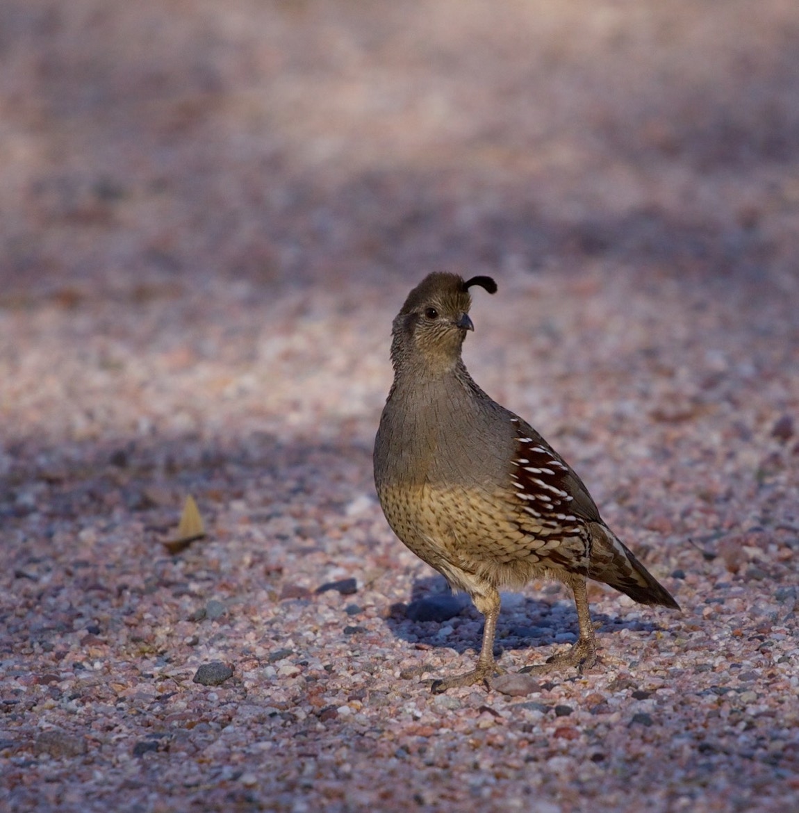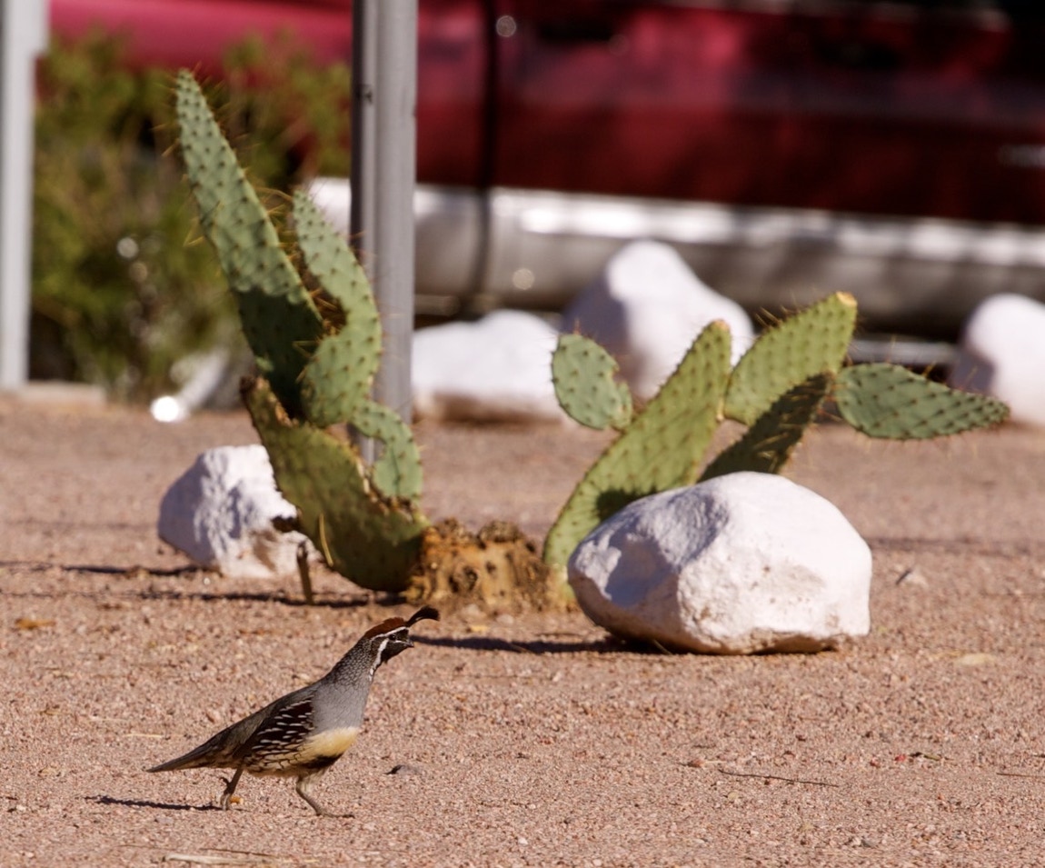 Als we daarna voor onze camper zitten lopen daar ineens weer die vogels met hun eigen wortel voor de neus. Of in ieder geval iets wat boven op hun kop staat als een soort wegwijzertje. We zijn er inmiddels achter dat dit gewoon kwartels zijn. En hebben we er bij Anza Borrego heel veel moeite voor gedaan om ze voor de lens te krijgen, hier komen ze tot op een paar meter van onze stoeltjes en kunnen we ze zonder enig probleem fotograferen. Zelfs in volle sprint. Geweldig gewoon. Misschien zien we ook nog wel coyotes over de campground lopen. Je weet het maar nooit.