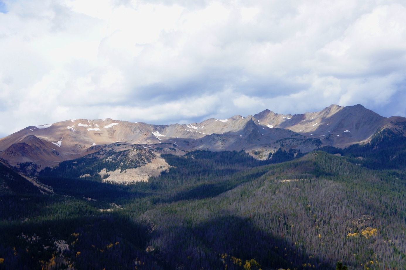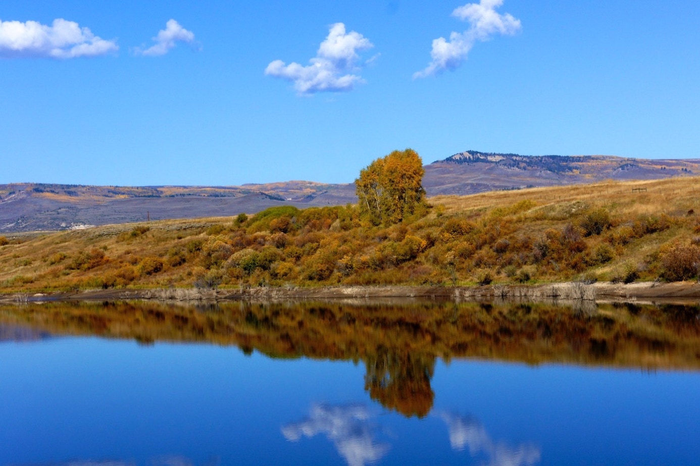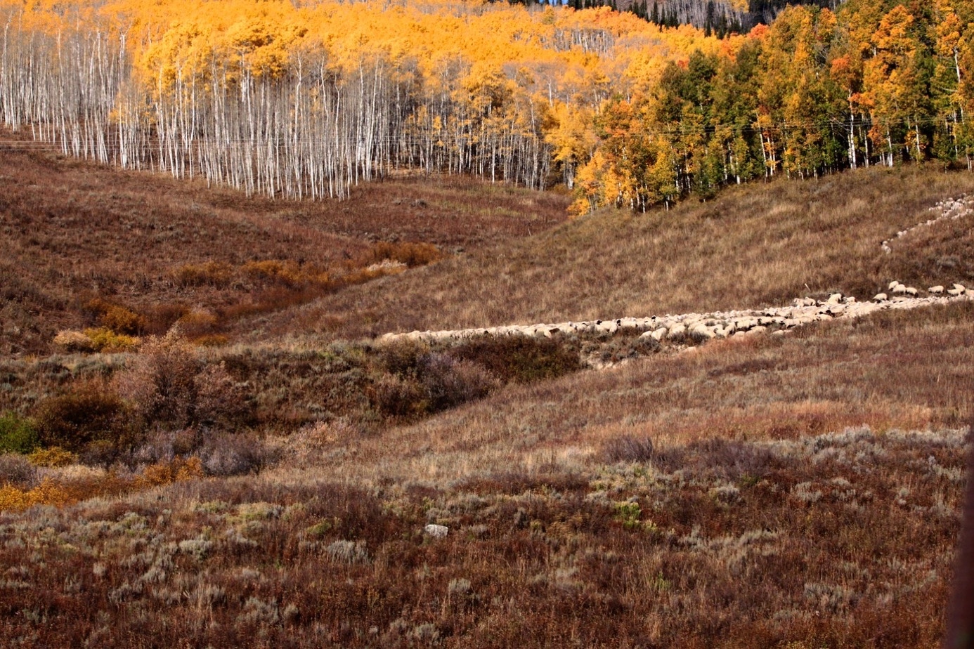 De weg die we rijden is jammer genoeg een beetje druk. Ik moet regelmatig even aan de kant om een rijtje snellere auto’s even te laten passeren. Daar hebben ze hier de turn-outs voor. En vandaag voor het eerst meegemaakt dat een Amerikaan dan toch wat geirriteerd raakt als hij achter een langzamer voertuig komt te rijden. Meestal gaat men er gemoedelijk een eindje achter rijden en wacht men rustig af tot er mogelijkheid tot passeren is of dat je aan de kant gaat. Maar goed: de weg van vandaag voert ons langs de schitterende herfstkleuren van de Rocky Mountains. Bijna letterlijk om stil van te worden en moeilijk om te beschrijven. Al die kleuren die op je af komen, van groen, donkergroen, geel, donkergeel, geel-rood, lichtgeel en meertjes er tussen door. Je moet het gezien hebben.