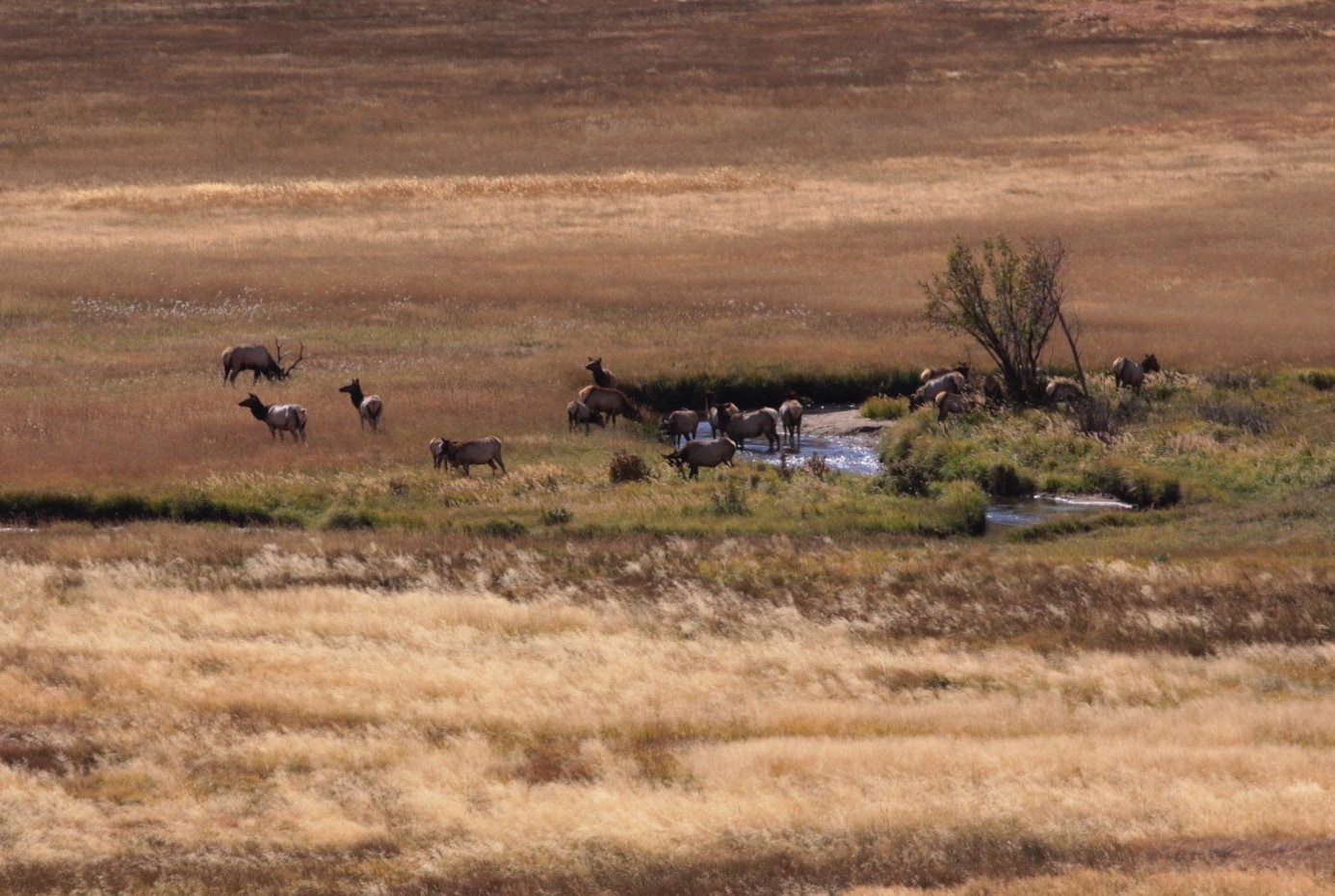 Overigens dachten we dat onze plek een geweldige plek was om Elks te zien. Aan een weide waarop je zou mogen verwachten dat een kudde Elks zich tegoed zou doen aan het gras daar. Welgeteld twee Elks hebben we gezien. En dat waren dan twee jonge mannetjes, die uit de groep zijn geknikkerd en het zelf moeten zien te rooien. Wel klinken steeds de kreten van de grote jongens vanaf de andere kant van de campground. En we horen ook coyotes huilen. Nu nog het gegrom van een beer erbij en het plaatje is compleet.