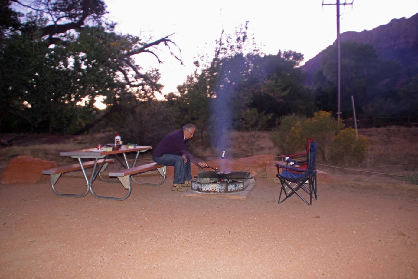 Een paar minuten voor 6 rijden we Zion in, en gaan naar onze camp plaats. Ook deze plaats ligt prachtig. We staan aan de Virgin River. We bekijken de zonsondergang en lopen een stukje langs de rivier. Hierna steken we de barbecue aan, die bij elke camp plaats is. We hebben vanmorgen 2 steaks gekocht, en die gaan we heerlijk braden.