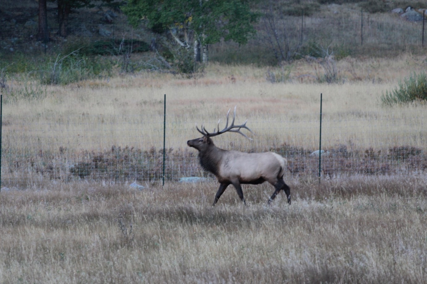 We ontbijten daarom gelijk en gaan weer vroeg op pad. De beste kans om toch nog een mannetjes-Elk te spotten. En dit keer loont het. Want als we links af het dal uit rijden zien we een man met een camera in de aanslag. En ja hoor daar zien we een mannetje, nee zelfs twee mannetjes. En als we onze ogen nog eens goed uitwrijven zien we verderop zelfs een hele kudde (misschien wel twintig) met nog een mannetje. Dus camper aan de kant, camera’s mee en schieten maar.