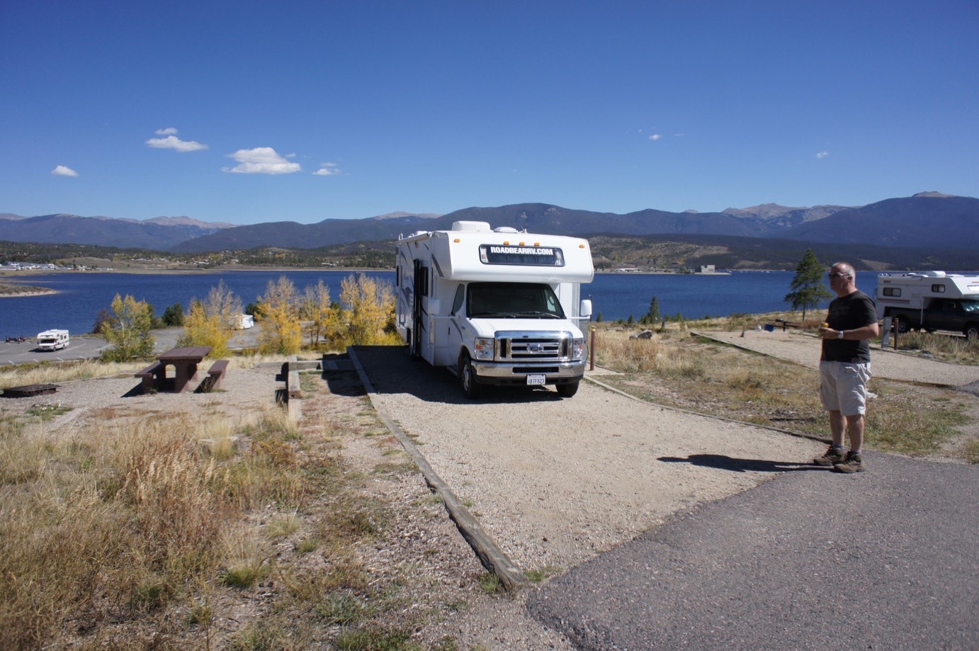 Het doel vandaag is Timber Creek campground. Als we daar om een uur of elf aankomen doen we een rondje over de campground en besluiten door te rijden. Het ziet er een beetje kaal en verlaten uit. Lijkt ons niet gezellig. Het alternatief: Elk Creek campground opgezocht. Ook daar staan we te twijfelen. Op zich ziet dit er wat “beter” uit, maar je kunt niet goed overzien hoe je komt te staan. Dus besluiten we ook hier weer verder te rijden naar een campground die ongeveer 46mile verderop ligt bij Kremmling (huh dat staat toch in Moskou met enige fantasie). En misschien zien we onderweg nog wel een statepark met een camping. En ja hoor, een half uur later staan we op Stillwater campground aan het Grand Lake. The room with a view van ons laatste hotel vorig jaar is er niets bij. 360 graden geweldig uitzicht: voor en links naast ons een groot meer (vandaar Grand Lake), overal om ons heen bergen met herfstkleuren, en rechts van ons o.a. een gigantische ranch. In één woord geweldig.