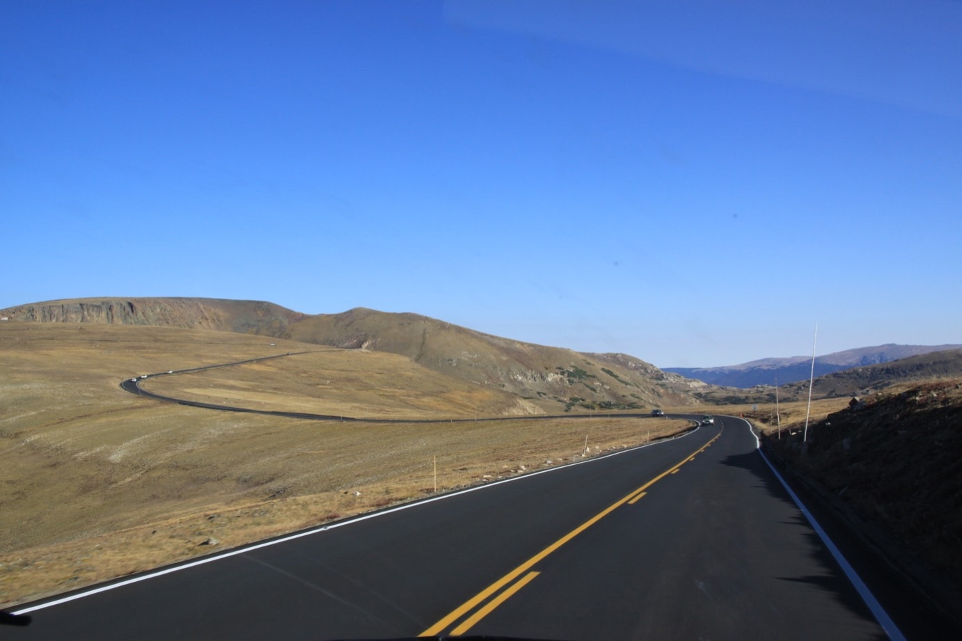 Affijn verder op weg naar de hoogste punt. En eigenlijk zijn we die een beetje ongemerkt voorbij gereden. We merken het pas als we iets verderop en lager het gesloten Visitors-centre “bezoeken” (#@$&).