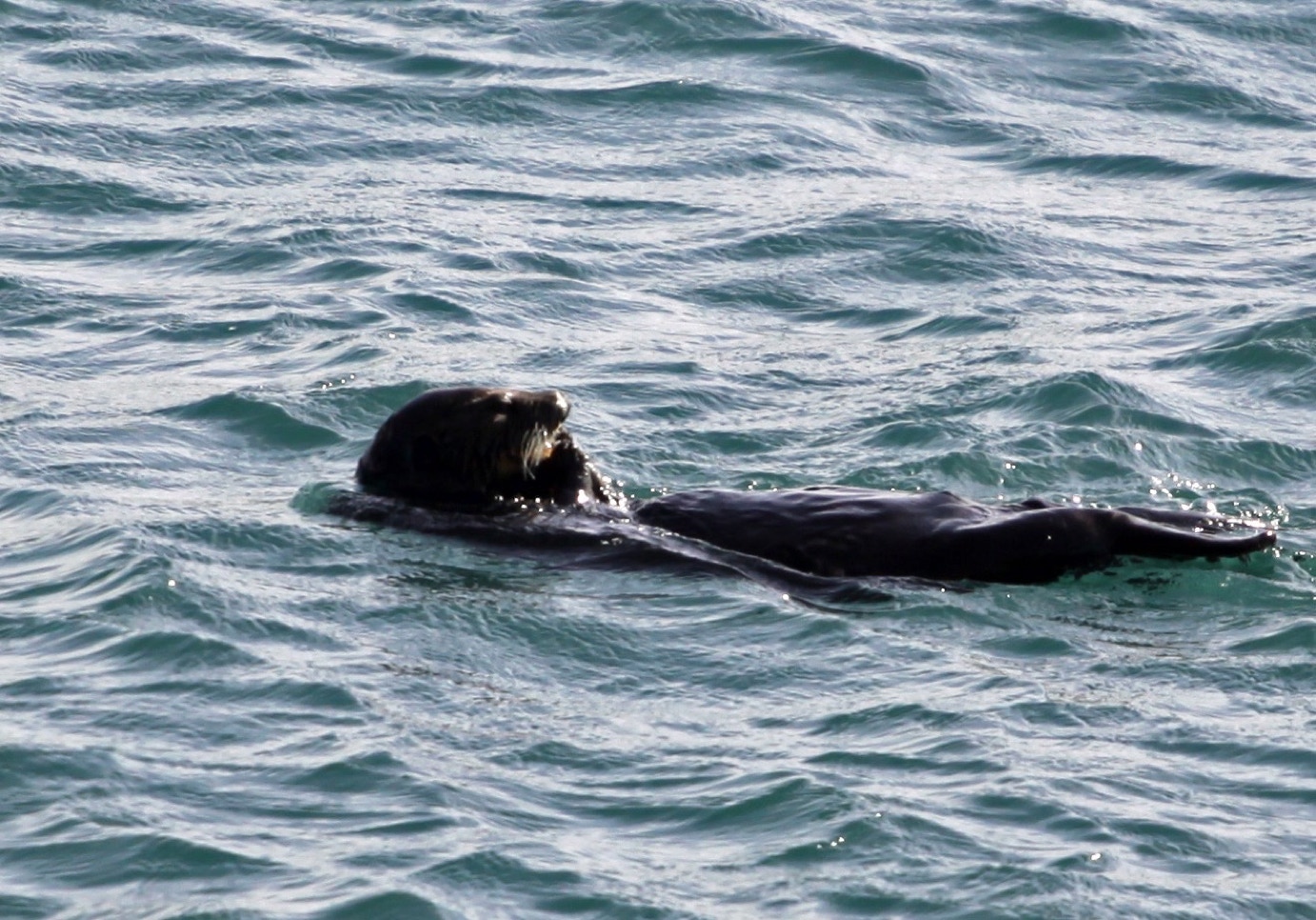 We lopen een eindje om de rots heen, maar zien alleen maar zeemeeuwen. Het lijkt net of er voor een paar van die meeuwen iets op het water drijft. Ik kijk nog eens goed en zeg tegen Marja: volgens mij heb je daar één van je zeeotters. Vlug de camera gepakt en geprobeerd een paar foto’s te maken. Maar het diertje zwemt veel te ver weg. Dus dat zullen wel geen mooie plaatjes worden. Na een tijdje lopen we weer terug en denken dan dat we wel geen otter meer te zien zullen krijgen. Maar ineens slaakt Marja een kreet: daar is er weer een. En deze zit veel dichter bij onze kant. Snel maar weer de camera gepakt en foto’s gemaakt. En gelukkig hebben we deze keer ook aan onze camcorder gedacht en maakt Marja ook nog een filmpje van het beestje. Geweldig om dit soort dieren in hun eigen leefomgeving te kunnen zien in plaats van in die benauwde hokken in dierentuinen.