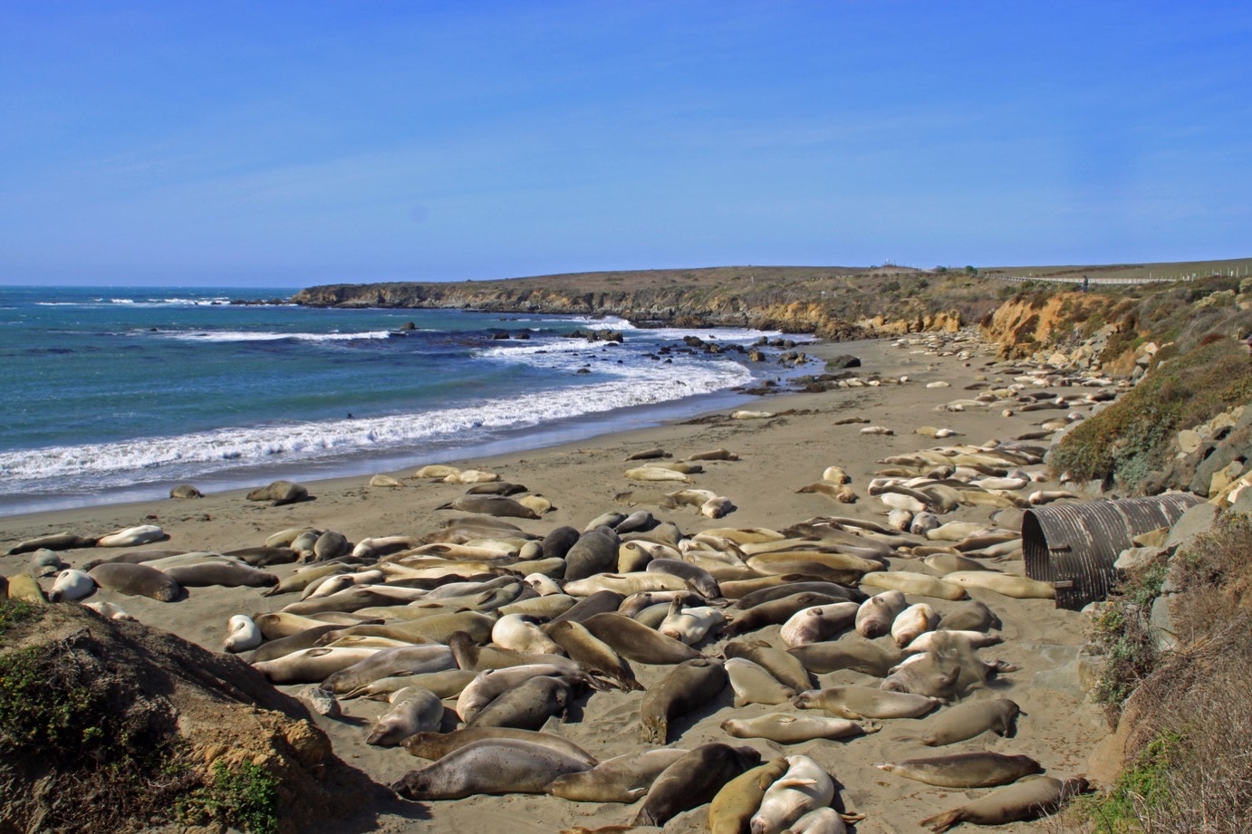 Nu komen we voor het eerst op een stuk van Hway 1 waar we deze route voor willen afleggen. De mooie stukken. Nadat we in Cambria getankt hebben (60 dollarcent duurder: had ik nou toch maar vanochtend in Pismo-beach getankt. Ach wat we zijn met vakantie, niet zeuren maar gewoon volgooien) komen we langs de Elephant-seal beach. Ook daar moet natuurlijk even gestopt worden. Geweldig zoals deze beesten lijken te genieten van hun middagdutje op het strand. Met z’n allen lekker languit in het zand. Even over je buik krabben, een beetje zand over jezelf en de anderen heen gooien en laat die paar rot-jongens verderop maar ruzie maken. Ook daar foto’s en filmpjes van gemaakt (die filmpjes gaat Marja thuis via U-tube of zoiets op het internet zetten).