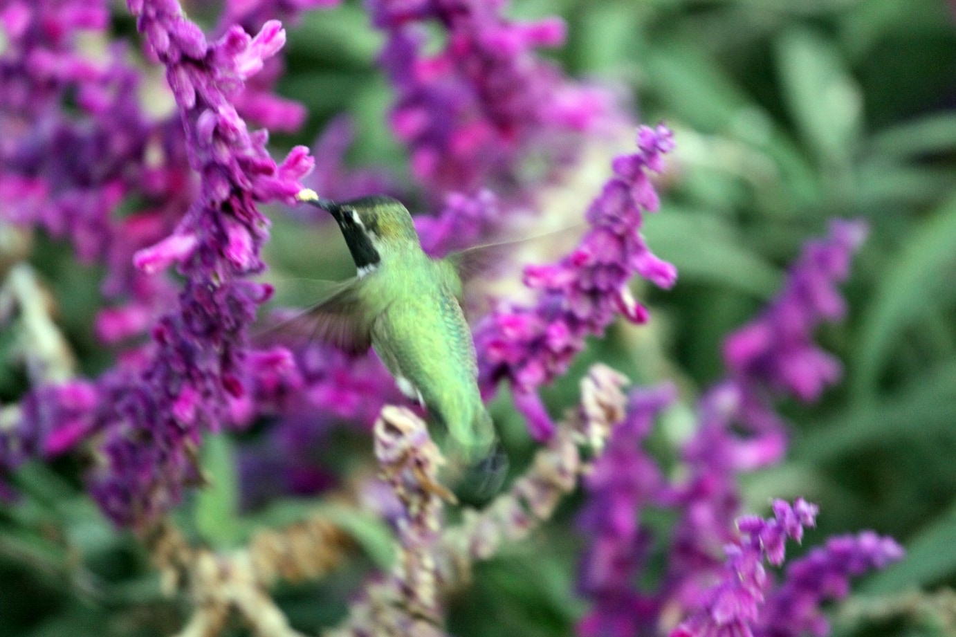 En wat nou het mooiste is: als Marja naar de laundry loopt komt ze op een gegeven moment glunderend teruglopen. Ze heeft namelijk humming-birds gezien. Niet één maar wel een stuk of vijf of zes (misschien nog wel meer). Ze vertelt dat eentje zelfs een soort van voor haar bleef hangen voordat ie met ritselende vleugeltjes vlak langs haar wegvloog. Ik natuurlijk gelijk mee en ja hoor een heleboel kolibries die af en aan vliegen bij een paar bloemenstruiken. Geweldig gewoonweg. Ze zijn helemaal niet schuw en we kunnen ze met de camera tot op een paar meter benaderen. En ze schieten soms met flinke snelheden op nog geen meter langs ons heen. Het is er een komen en gaan van die beestjes. Grandioos. En dan de kleuren op die koppetjes. Onze dag kan niet meer stuk. En dat hebben we toch ook een beetje aan die eerste camping te danken. Als die er niet zo on-uitnodigend uit had gezien hadden we nu niet hier gestaan