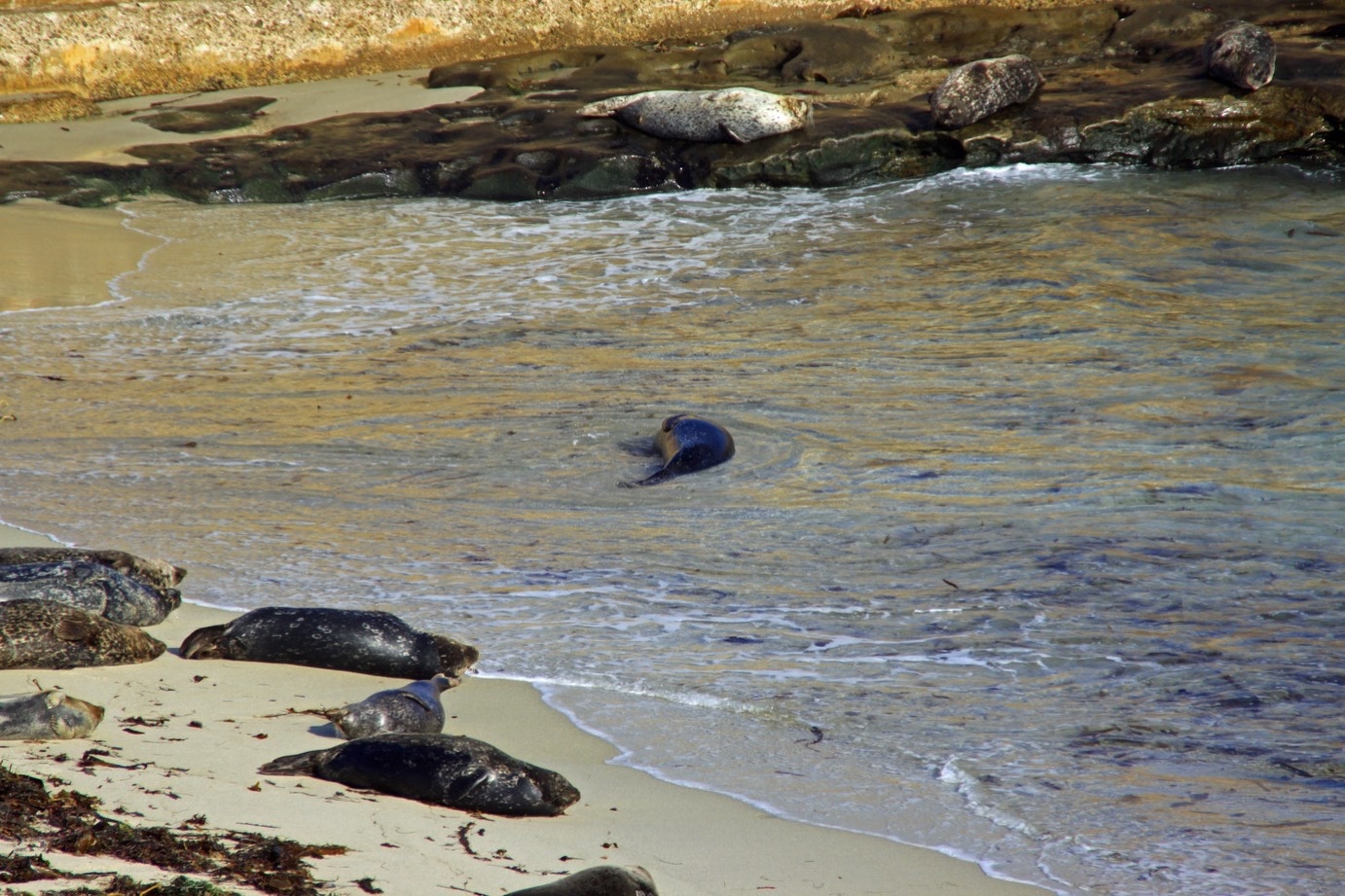 We lopen een stukje langs de kust en kunnen dan ook gelijk zien voor welke problemen ons aller Arnold (Schwarzenegger) zich gesteld ziet. Eens kijken of hij de zeeleeuwen in opdracht van de rechter al heeft weggejaagd van het stukje strand dat voor kinderen bedoeld schijnt te zijn. Mooi niet, die exterminator heeft andere (financiële) zorgen met zijn staat. “Gelukkig” maar anders hadden wij nu naar een leeg stukje strand staan staren. Nu waren er tenminste nog een paar van die diertjes lekker aan het zonnen en één liet zich lekker meerollen met de golven (heen en weer, heen en weer).