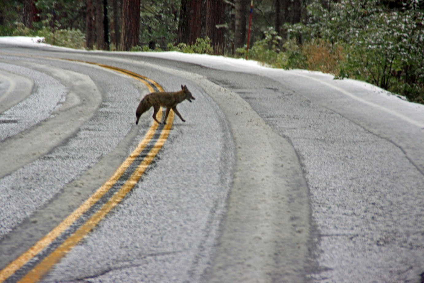 Op een gegeven moment steekt een coyote vlak voor onze auto de weg over, en omdat ik het fototoestel in mijn handen heb, lukt het om er foto’s van te maken.