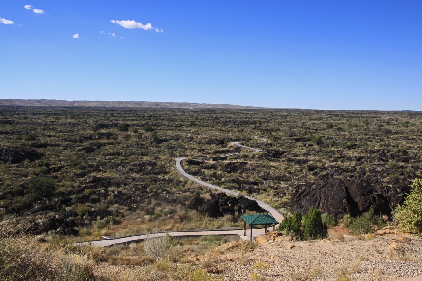 Onderweg nog even de vraag of we in de buurt van Nogal naar een camping zullen rijden of dat we doorgaan naar de Valley of Fires. Het wordt de laatste. En wat een bijzondere plaats is dit weer. Nou weet ik niet of die naam komt omdat dit een vallei is waar ook weer de lava omhoog geperst wordt of vanwege de hoge temperaturen. Ik hou het op het laatste, maar het zal wel het eerste zijn. We maken ook nog even een korte wandeling over een soort “loopplanken” over dat lava heen. Volgens één van de mensen van de campground zouden we wel eens tarantula’s (die zijn aan het migreren zei hij) en grote (20 cm) hagedissen kunnen tegenkomen (de black-collar hagedis. Die laatste kan ook nog eens agressief zijn. Maar wij zijn niet bang en dat hoeft ook niet, want: geen hagedis gezien. Alhoewel ik even het idee had dat ik in de verte een hagedis zag wegkruipen. Een kleiner broertje (of zusje) van die hagedis heeft een hele tijd bij onze camper in de zon gezeten en indrukwekkend zitten doen met het optillen van zijn poten en zo.