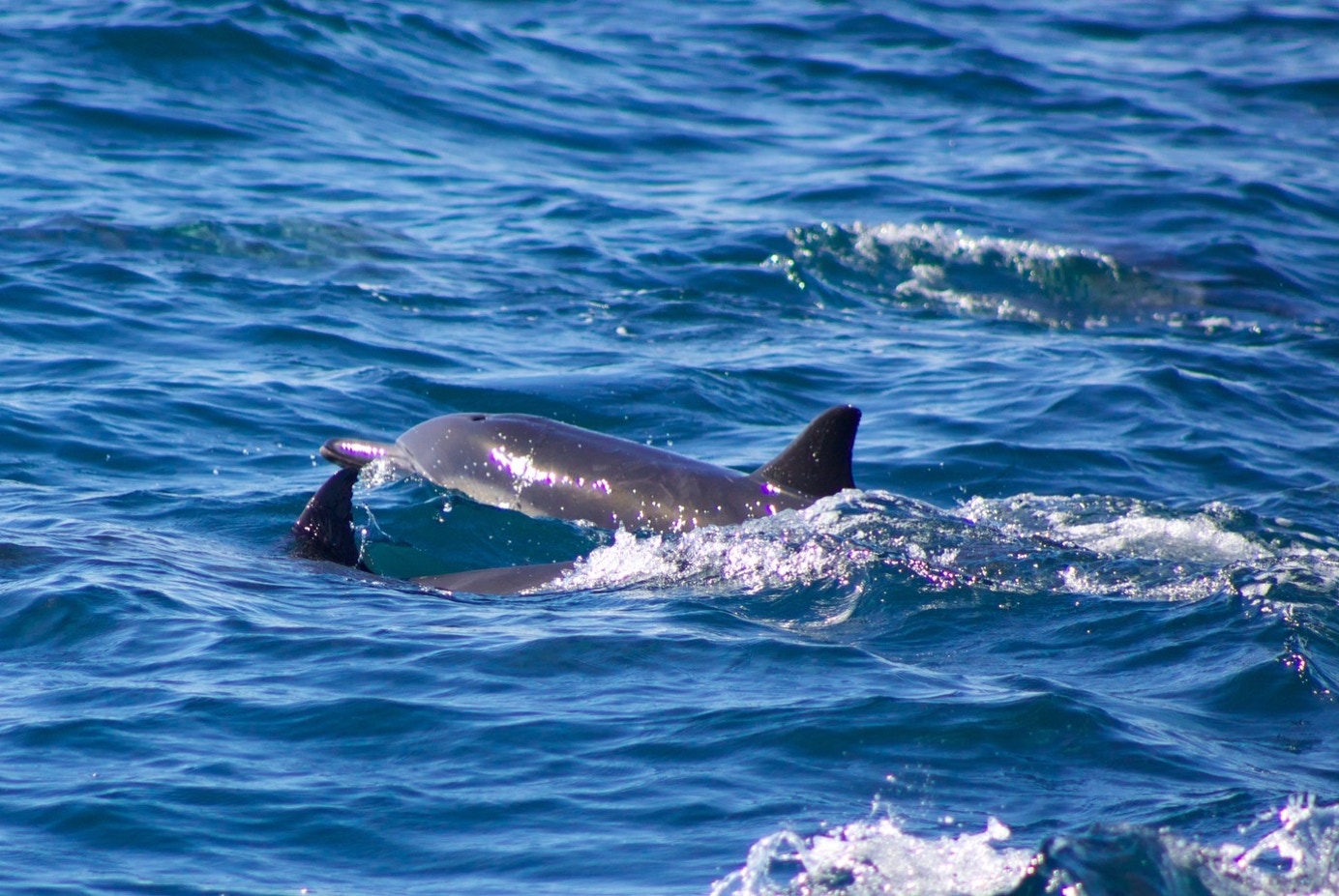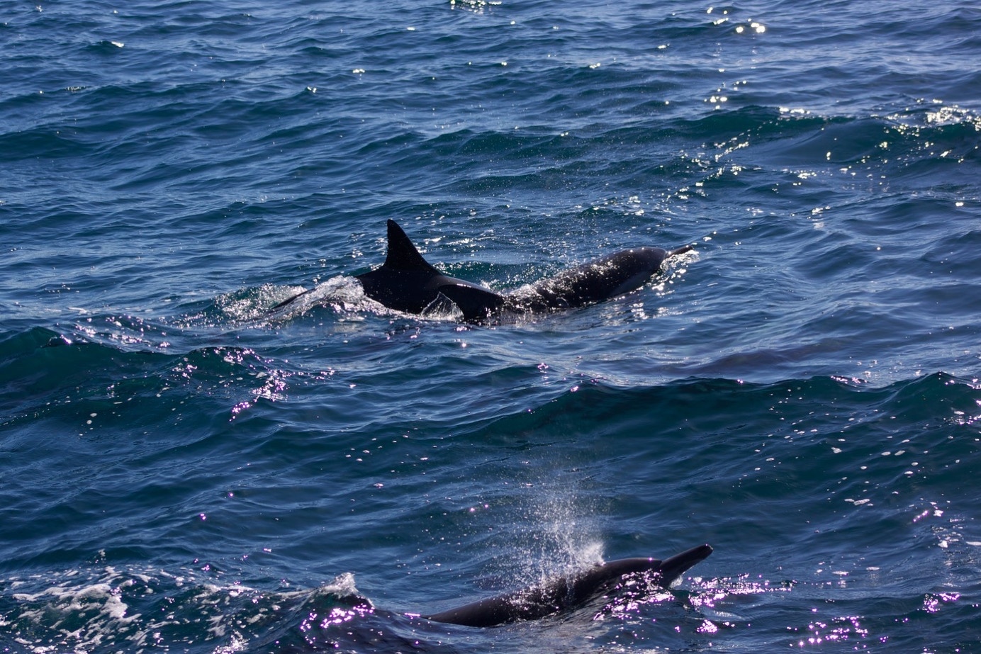Maar gelukkig, als we dichterbij komen zien we nog steeds gespartel en gespetter en zien we ineens een heleboel dolfijnenlichamen het water doorklieven. Geweldig, toch nog dolfijnen. Het blijken de common-dolfins te zijn, maar dat maakt ons niet uit.