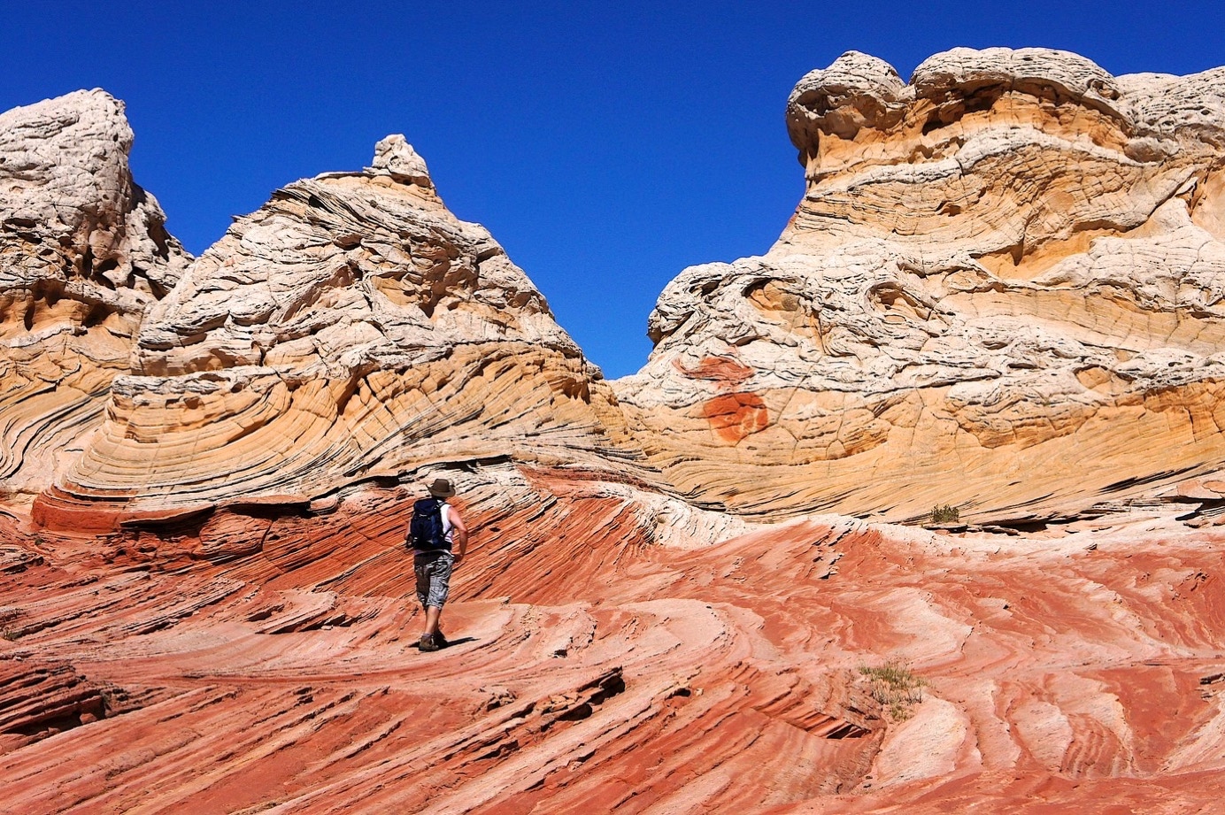 We hebben ongeveer twee uur om foto’s te maken. Dus we gaan driftig aan de slag eb schieten het ene na het andere plaatje. Mike pakt het wat professioneler aan en is nog met zijn eerste shots bezig op het eerste gedeelte van White Pockets als wij ook het lager gelegen deel al voor een groot deel in beeld gebracht hebben. Natuurlijk zijn er nog veel meer foto’s te maken, zoveel verschillende rotsvormen er zijn. Na ongeveer 1 uur en 40 minuten zijn wij terug bij de auto en is het wachten op Mike en Cheryl. Die komen om exact twee uur bij de auto aan.