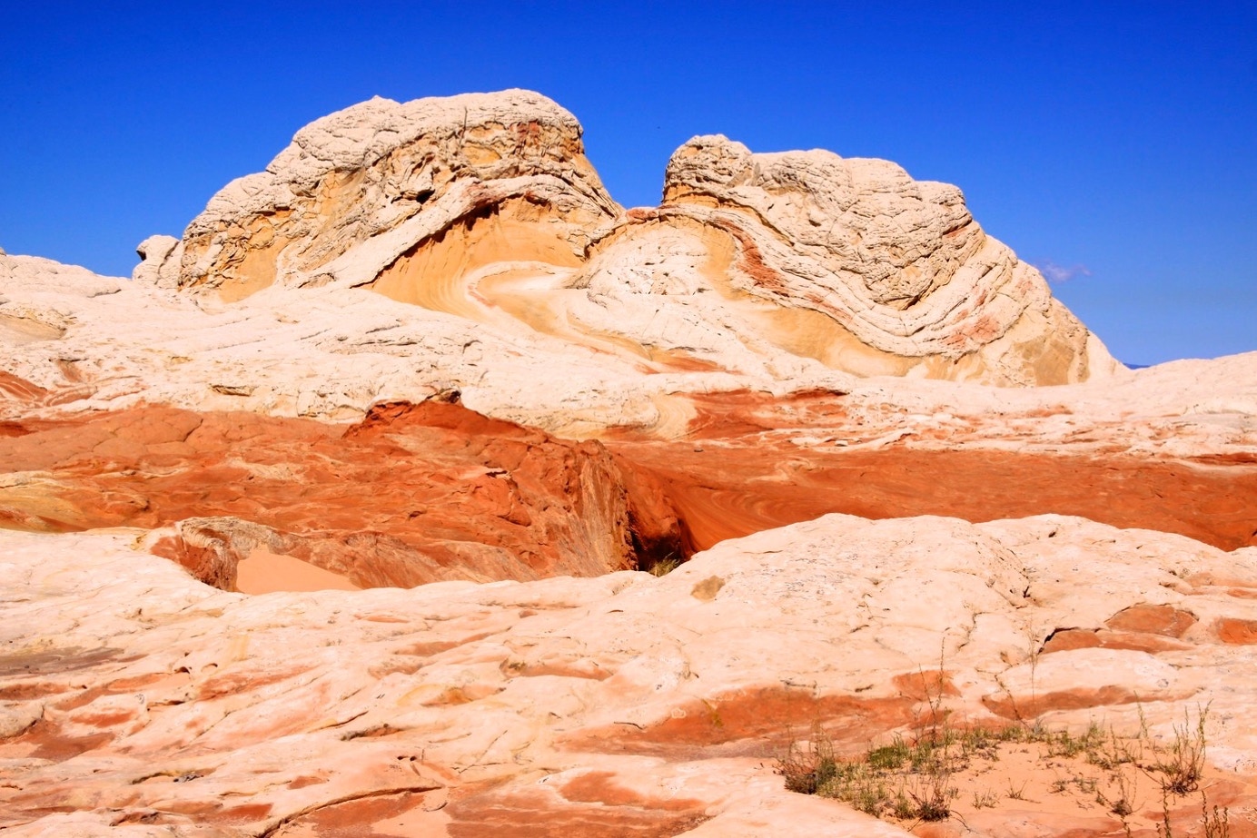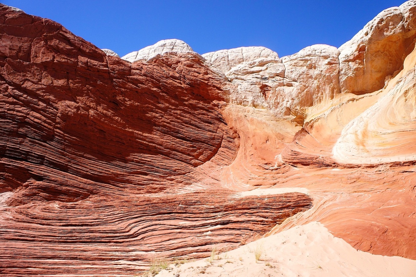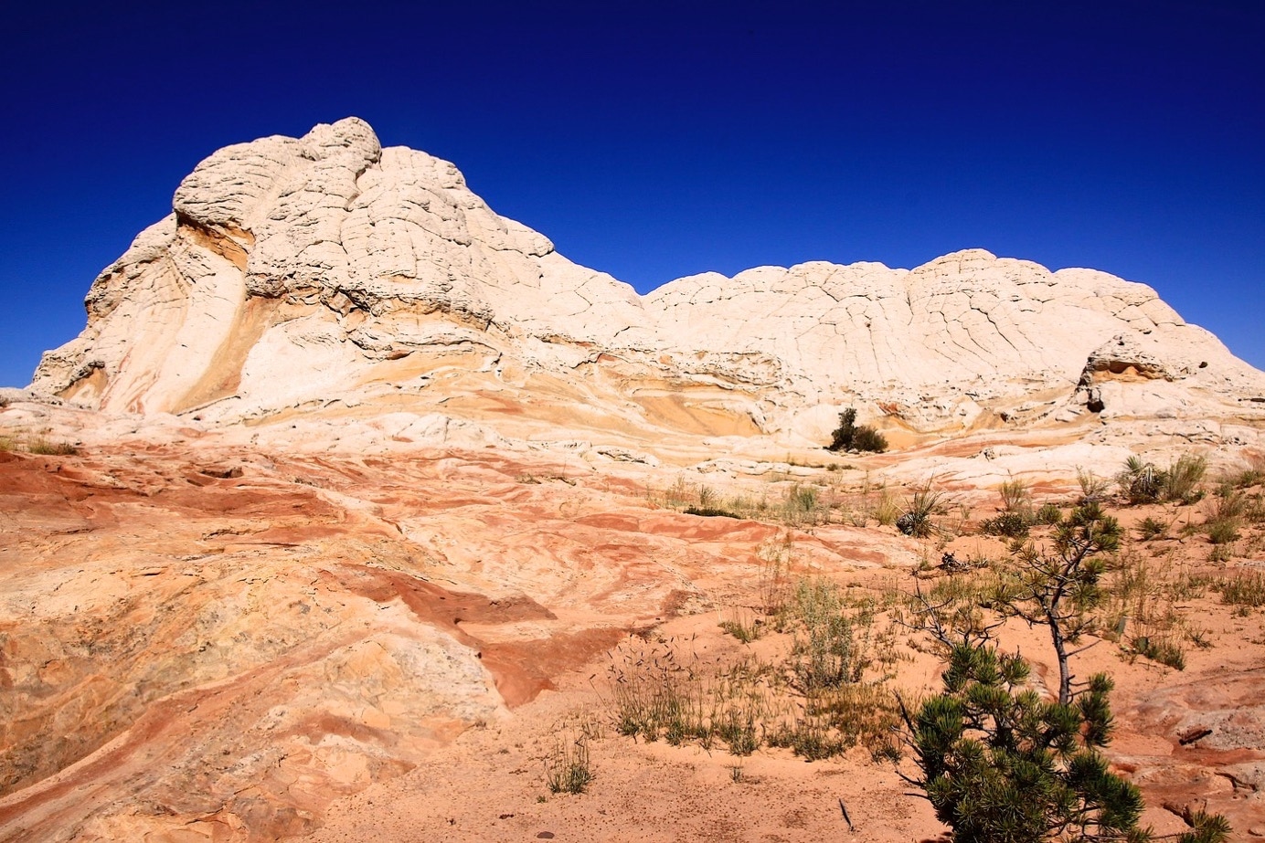Wij rijden met de RV achter Terry aan tot Jacob Lake, omdat we daarna doorgaan naar Grand Canyon en het wat zonde zou zijn eerst weel helemaal terug te moeten naar Kanab. Ik vraag hem of hij rustig wil rijden. Ik moet hem tenslotte volgen met de camper. Geen probleem zegt ie, ik rij niet hard. Yeah richt. We zijn Kanab nog niet uit of we overschrijden de toegestane snelheid al. En als we weer omhoog en omlaag moeten rijden, waar mijn snelheid af en toe sterk afneemt als we omhoog gaan rijdt ie een aardig eind voor ons. Gelukkig is er maar één weg naar Jacob Lake en kunnen we niet misrijden. Bij Jacob Lake parkeren we de RV, pakken onze spullen en stappen over in de Jeep van Terry. Ik ben de langste dus ik mag voorin. We rijden eerst een half uur over een normale weg naar beneden, maar dan slaan we links af en rijden een dirt-road op. De snelheid wordt nauwelijks minder en we hobbelen er aardig op los. Totdat we vanaf deze “weg” rechtsaf slaan en het alleen nog maar erger wordt. Met delen zandweg, stukken waar de rotsen ongeveer een halve meter boven de grond uitsteken en nog meer van dat soort dingen. Vanaf de verharde weg tot ons doel hotsen en botsen we alles bij elkaar ongeveer een uur tot aan ons doel: White Pockets. En dan wordt je toch weer even stil. Hebben we onderweg naar beneden al met onze mond open gezeten toen we de Vermillion Cliffs zagen, deze White Pockets zijn nog weer een andere speling van de natuur. HIer zijn weer rotspartijen omhooggeduwd die weer heel anders zijn, dan we tot nu toe gezien hebben. Bovendien heb je vanaf deze White Pockets ook nog eens geweldige vergezichten op bergen en natuur die vele mijlen verwijderd liggen.