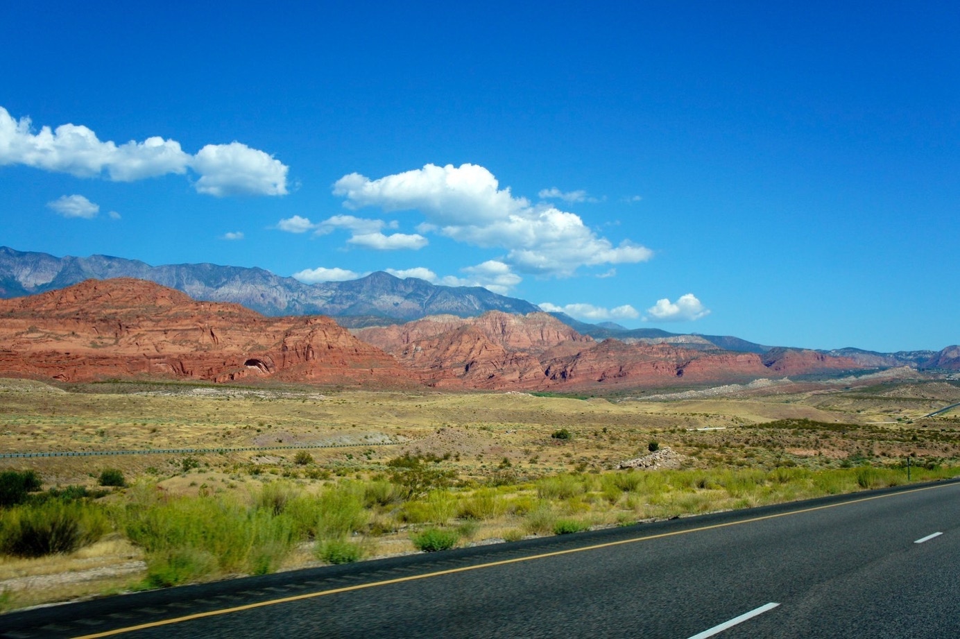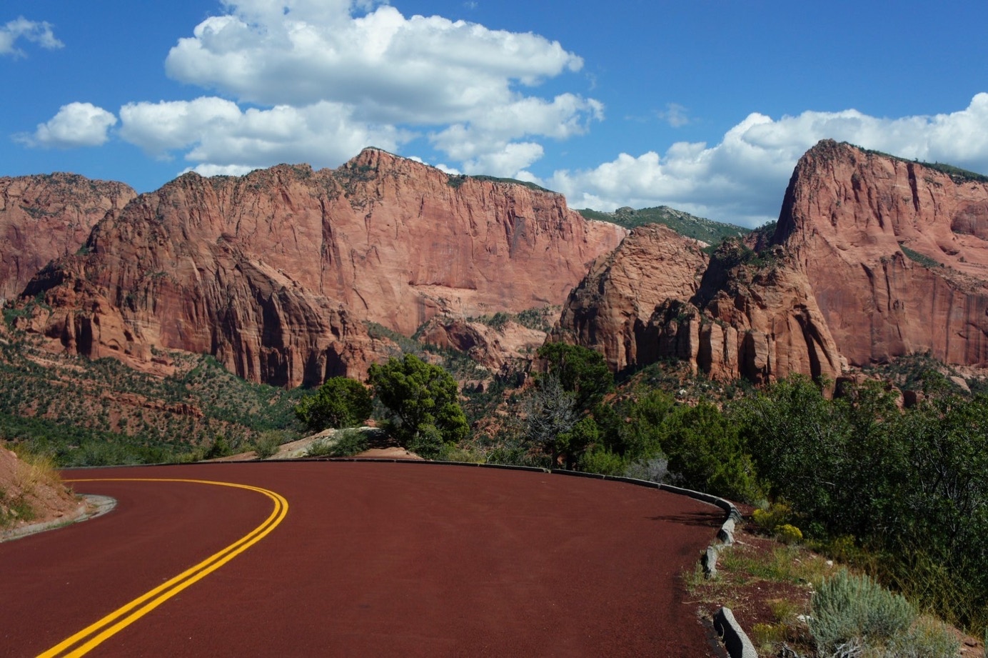 De rit naar Zion is geweldig. De bergen die je dan onderweg ziet zijn zo bizar mooi, dat je er letterlijk stil van wordt. De ene berg is nog imposanter dan de ander. En niet omdat ie hoog of groot of wat ook is. Maar het zijn vooral de kleuren die indruk maken. Van geel tot zwart, met een laag rood boven een grijze laag, boven een zwarte laag en dan weer rood of varianten daarop. Voordat je in die omgeving komt rijdt je nog wel over opnieuw enorme dalen, met aan alle kanten bergkammen. En soms rijdt je op zo’n bergkam aan en vraag je je af waar de weg naar toe gaat. Gaat ie links, gaat ie rechts. Nee dan zie je ineens, op die lange glooiende hellingen naar de voet van die bergen toe, een paar hele kleine autotjes rijden. En dan blijkt de weg eigenlijk gewoon min of meer rechtdoor te gaan en achter een bergrug die voor de grotere rug staat langs aangelegd te zijn. En zo kom je dan in de Virgin-river gorge. Een kloof waar men dan maar een weg in aangelegd heeft. Wel zo makkelijk: scheelt een hoop bikken en opblazen denk ik zo maar.
