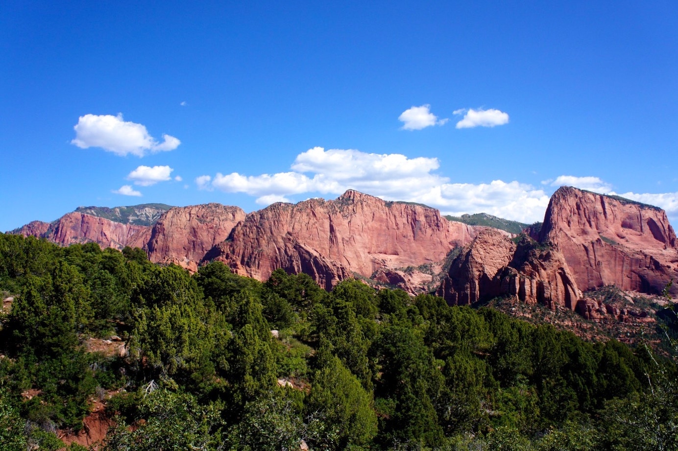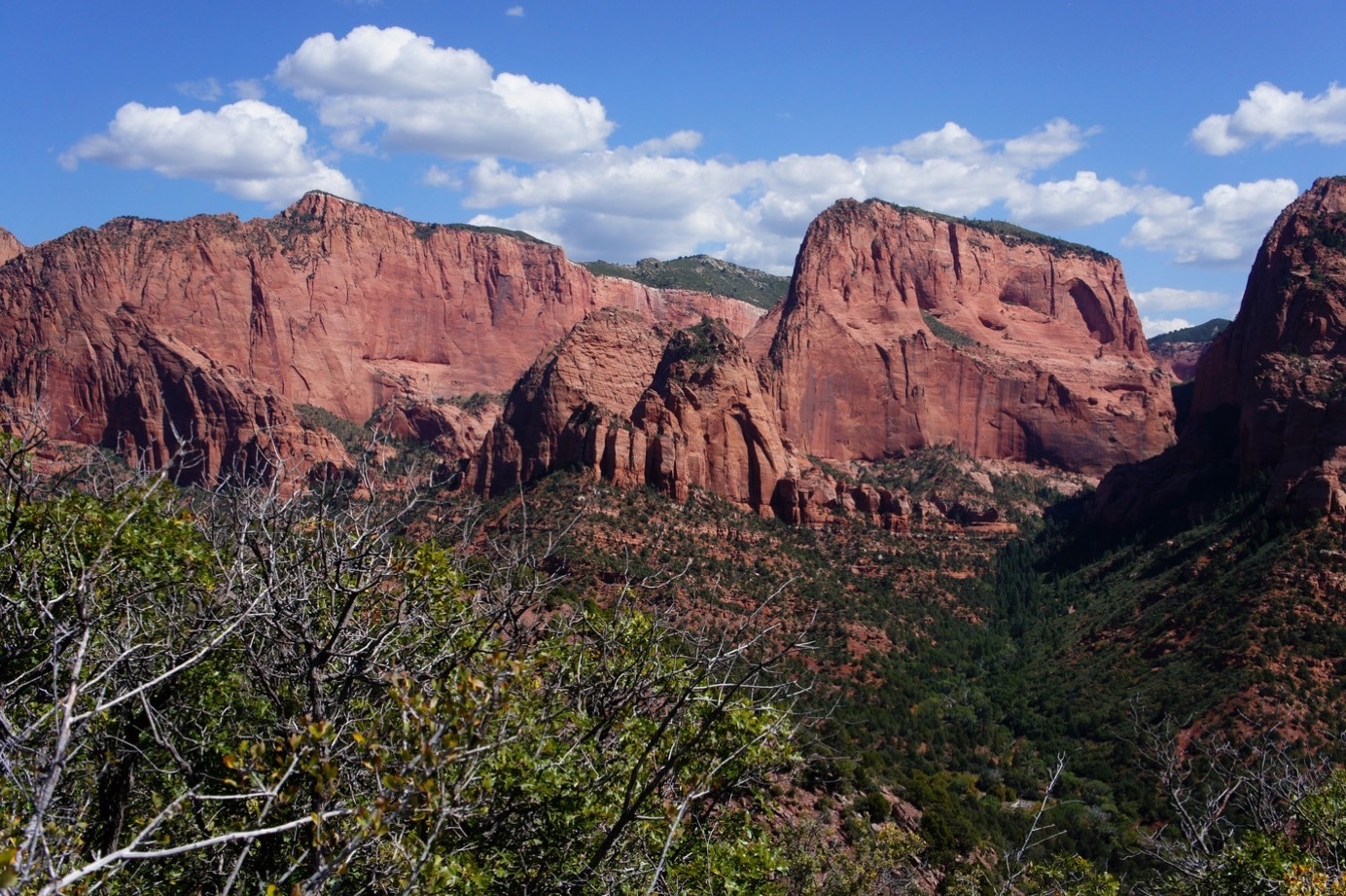 In eerste instantie rijden we de afslag naar Zion echter voorbij. We gaan nl. eerst even kijken bij Kolob Canyon. Ook onderdeel van Zion, maar dan meer aan de noordkant van Zion gelegen. Hier doen we een kort tourtje (10 mijl heen en terug) van een paar schitterende views op deze canyon. En we lopen ook nog een korte trail van 1 mijl (heen en terug), maar wel met toch nog wel een hoogteverschil van 30 m op die korte afstand. Maar het is te doen, alhoewel we toch niet helemaal tot het einde gaan. Wel maken we een aantal schitterende foto’s al zeg ik het zelf. Rode rotsen die volgens het verhaal een aantal 10-duizenden jaren geleden in feite gewoon omhoog gedrukt zijn. Bizar maar waar.