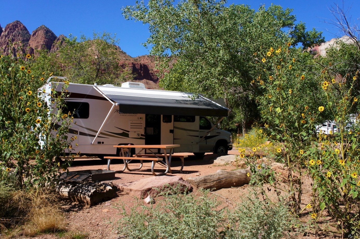 Op de campground hebben we overigens weer een geweldige plek. Weinig mensen direct naast ons en de Zion-river vlak achter onze camper.Het valt ons op dat er veel meer water door dit riviertje wordt afgevoerd, dan twee jaar geleden. Maar het heeft hier dit jaar ook fors geregend. Zo erg zelfs dat de campground veel later openging dan gepland. Als je het riviertje nu ziet, kun je je nauwelijks voorstellen dat daarin misschien nog wel 1,5-2 m meer water zou staan dan nu. En aan welk oppervlak je dan moet rekenen. Maar goed daar hoeven we ons nu niet druk om te maken. Want het is geweldig weer, met opnieuw blauwe luchten en een middagtemperatuur van boven de 30 graden.